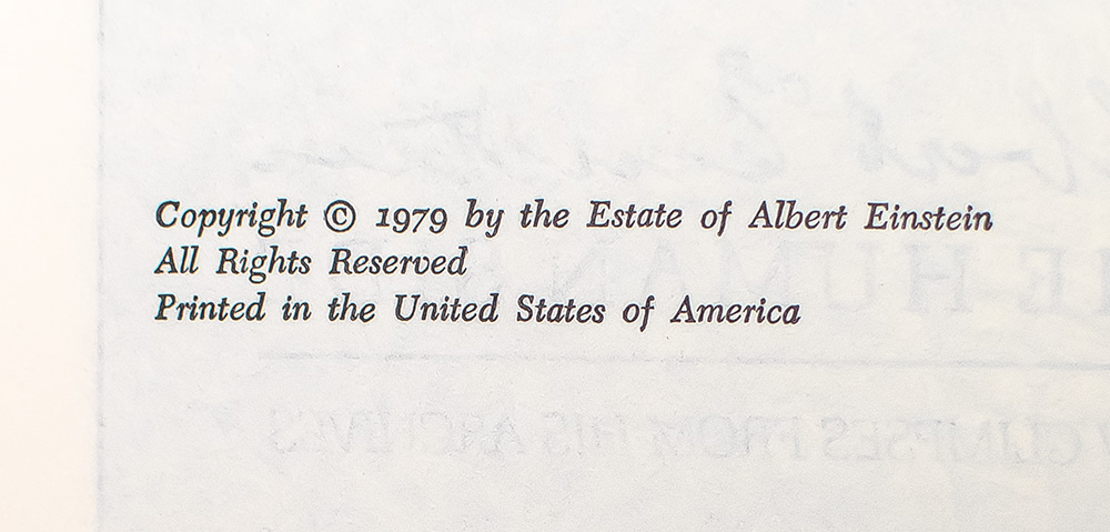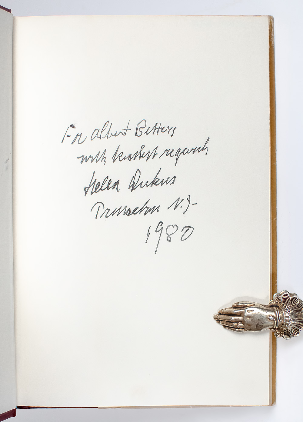 First Book Club edition of this curated collection of Einstein’s writings. Octavo, original leather, frontispiece. Presentation copy, inscribed by Helen Dukas on the front free endpaper. Helen Dukas (1896–1982) was Albert Einstein’s longtime secretary and trusted confidante, serving in that role from 1928 until his death in 1955. Deeply involved in preserving and organizing Einstein’s legacy, she co-edited several collections of his writings and letters, and played a key role in curating the Einstein Archives at the Institute for Advanced Study in Princeton. Fine in a good dust jacket, with bumping and light chipping to the extremities, and a closed tear to the hinge of the front panel.