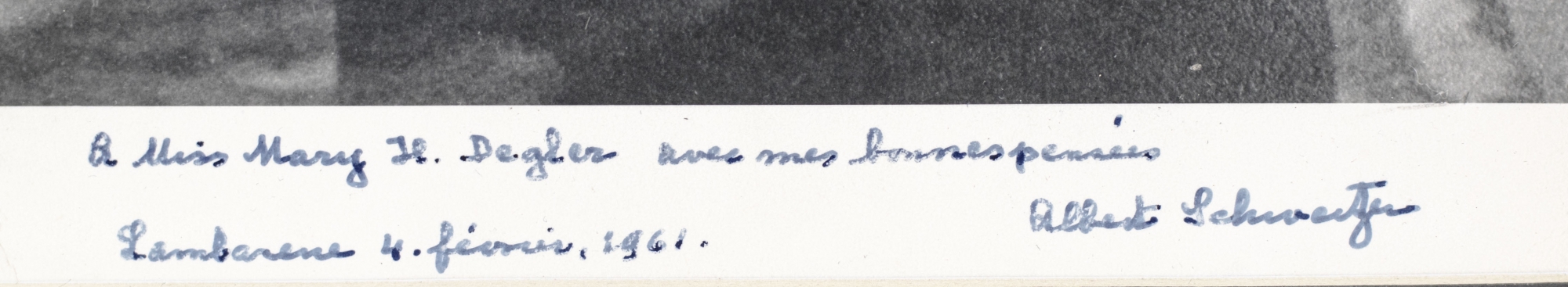 Signed photograph of Albert Schweitzer, lengthily inscribed and dated by him in 1961. The entire piece measures 14 inches by 17.5 inches. Double matted and framed, the entire piece measures 17.5 inches by 15.5 inches.