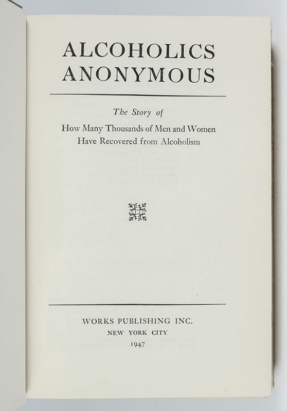 First edition, eleventh printing of Bill Wilson’s classic work, one of the best-selling books of all time, having sold 30 million copies. Octavo, original red cloth. Contemporary inscription to the front free endpaper, near fine in a very good dust jacket. A nice example, uncommon in the original dust jacket.