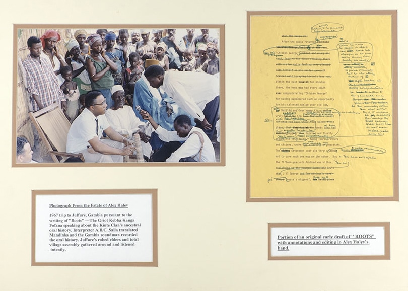 Rare original typescript manuscript leaf from an early draft of Alex Haley's Roots, “the most highly acclaimed book of our time” (Washington Post). Double matted with a large full-color photograph from Haley's estate taken in the tiny village of Juffure in northern Gambia where Haley first met his African relatives of the Kinte clan in 1967 including the griot whose stories were one of the inspirations for the Roots. The photograph shows The GriotKebba Banga Fofana speaking about the Kinte clan's ancestral oral history. The manuscript reads in part, "Within the next ten minutes there, the news had every adult congratulating "Chicken George" for hacing maneuvered such an opportunity for his talented twelve year old Tom." Haley has made numerous corrections to this portion of the text and added several paragraphs in his hand. In near fine condition.
