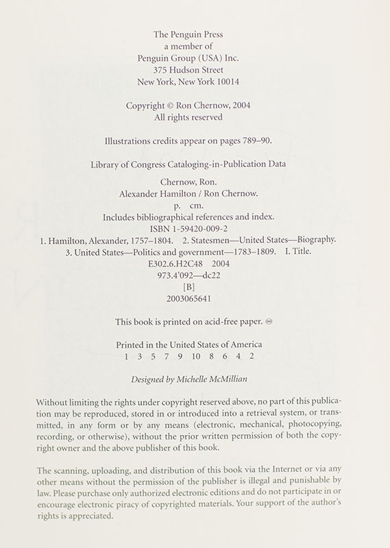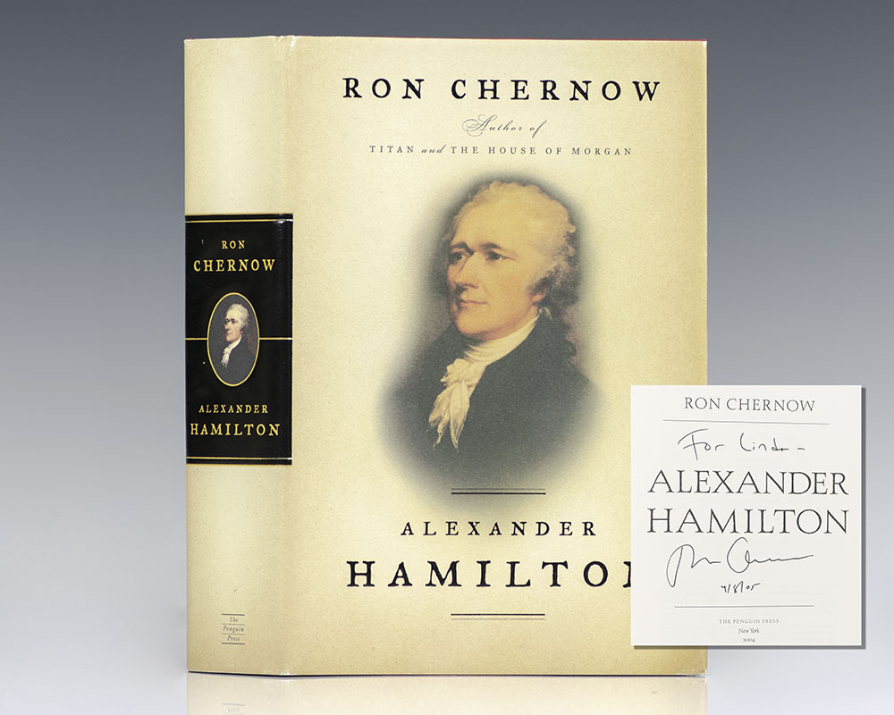 First edition of this landmark biography of Alexander Hamilton. Octavo, original half cloth, illustrated. Presentation copy, inscribed by the author on the title page, "For Linda- Ron Chernow 4/8/05." Fine in a near fine dust jacket. Jacket design by Gabriele Wilson.