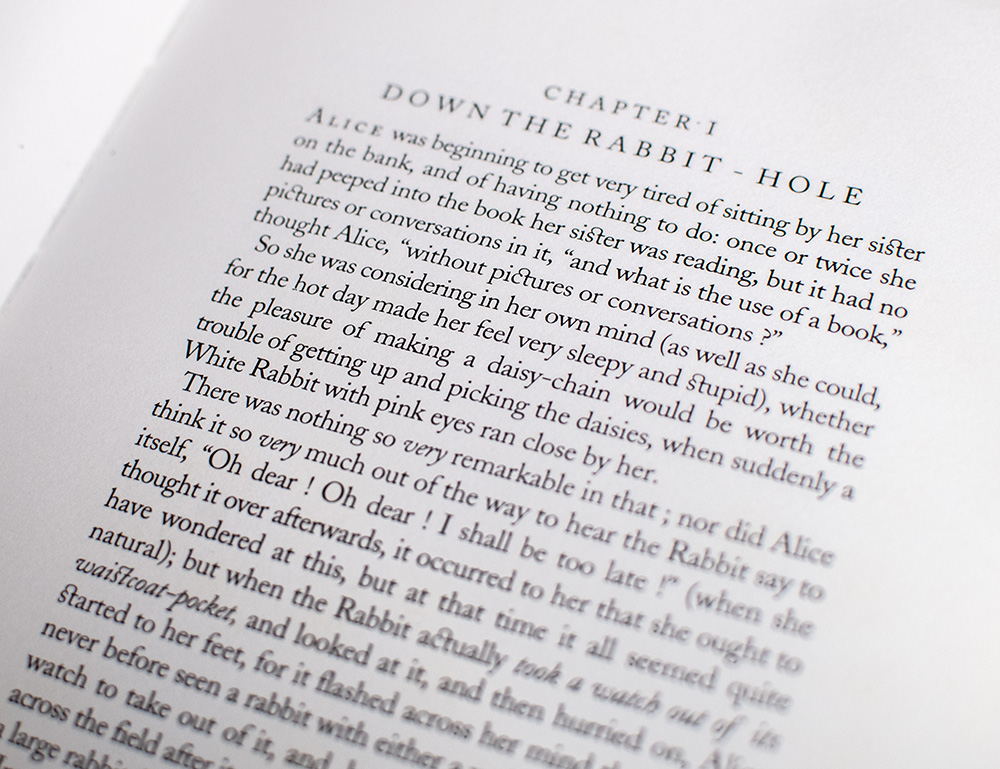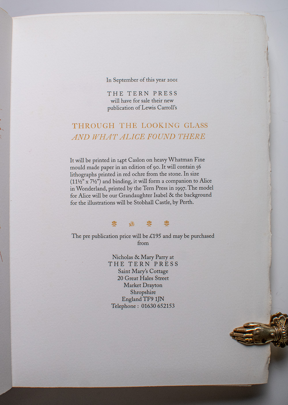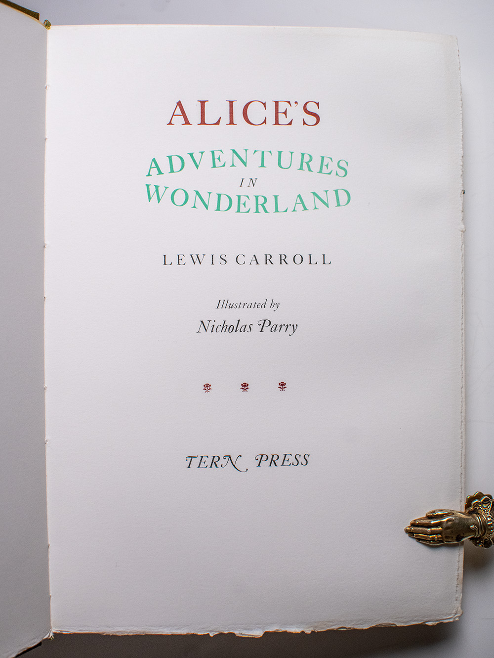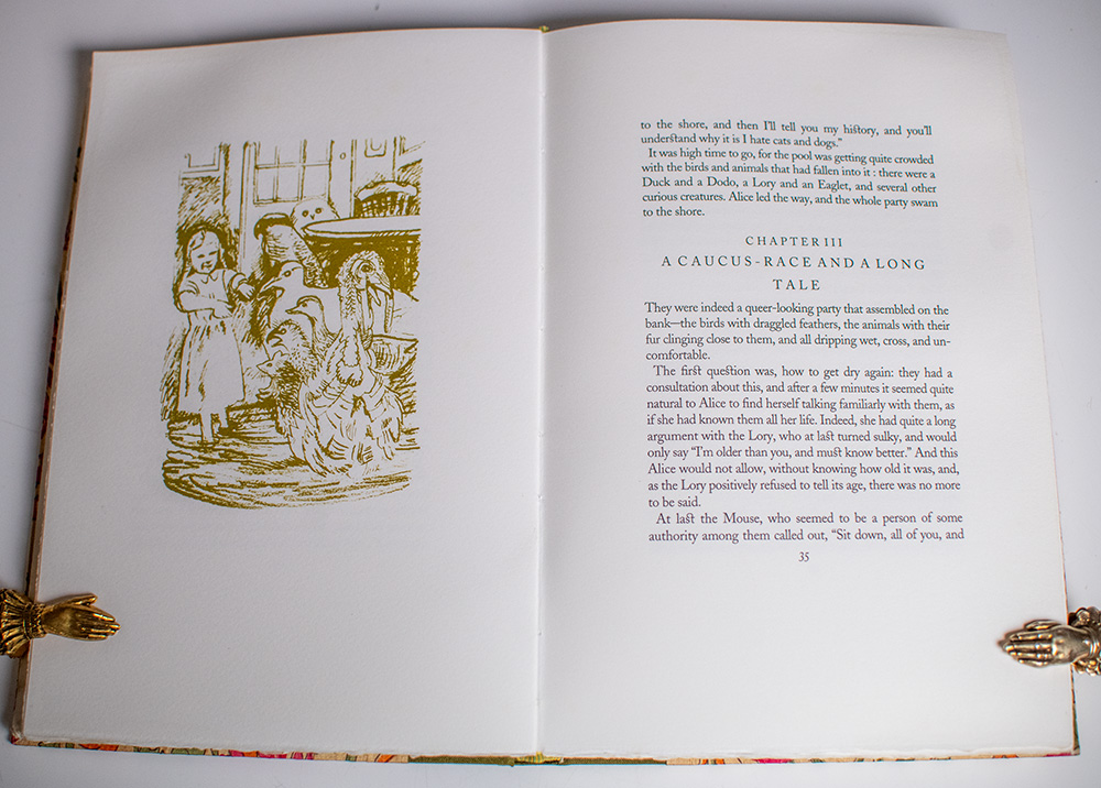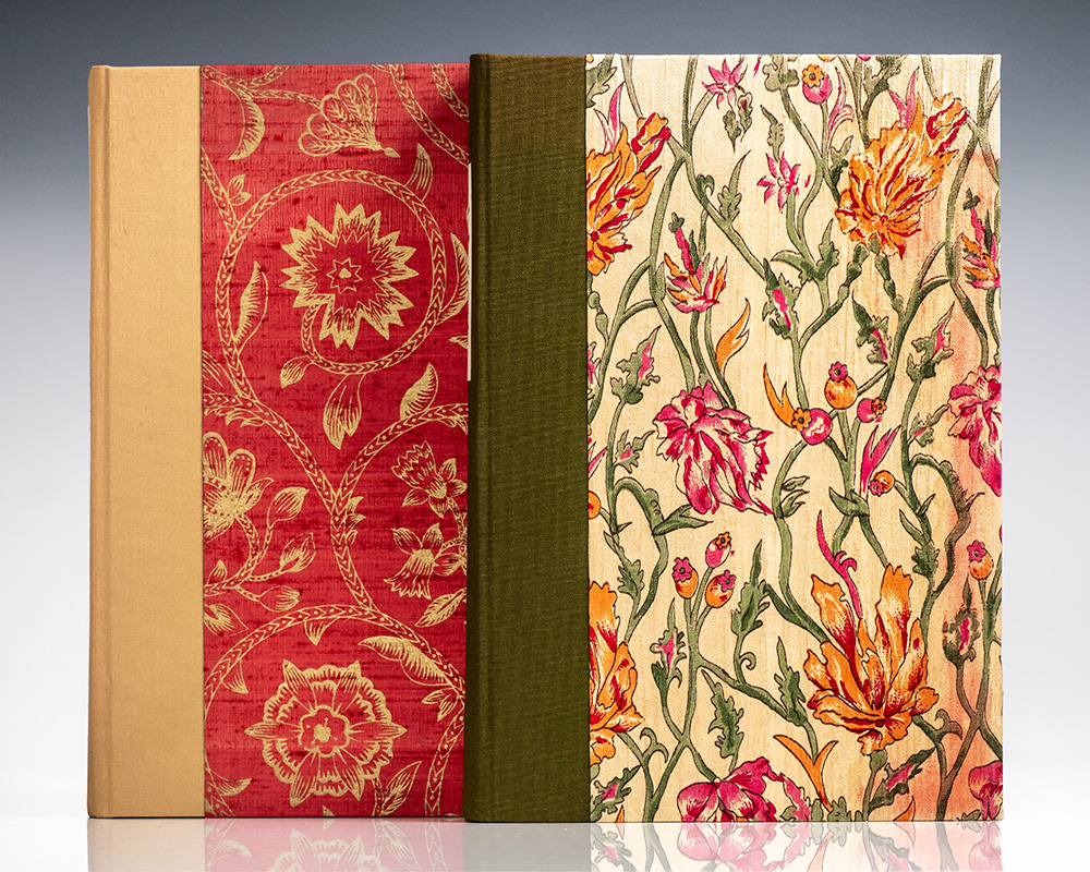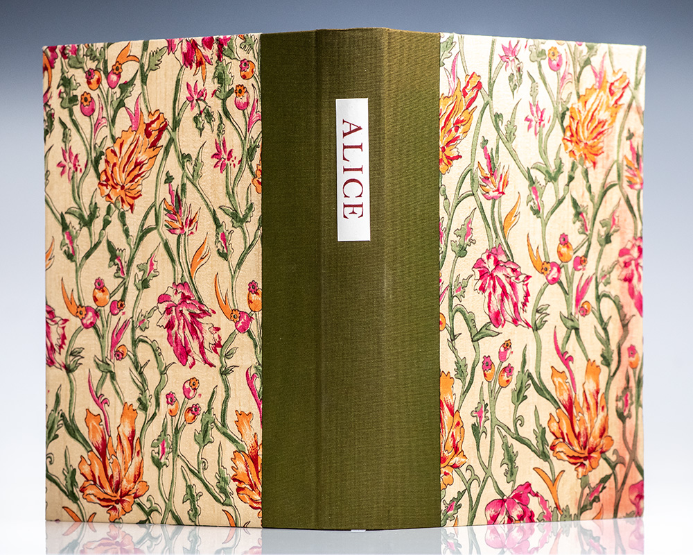 The Tern Press signed limited edition of Lewis Carroll’s beloved children’s classic. Octavo, two volumes, original cloth-backed floral boards by Mary Parry with paper titles to the spines, illustrated with lithographs throughout. Boldly signed by illustrator Nicholas Parry and binder Mary Parry on the colophon page at the rear of volume one; also signed by both in volume two with the additional signature of their granddaughter Isabel Arrowsmith, the model for Alice. One of 90 numbered copies, volume one is number 11 and volume two is number 10. In near fine condition. Accompanied by the prospectus for Through The Looking-Glass laid in. A very attractive set.