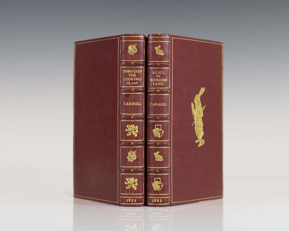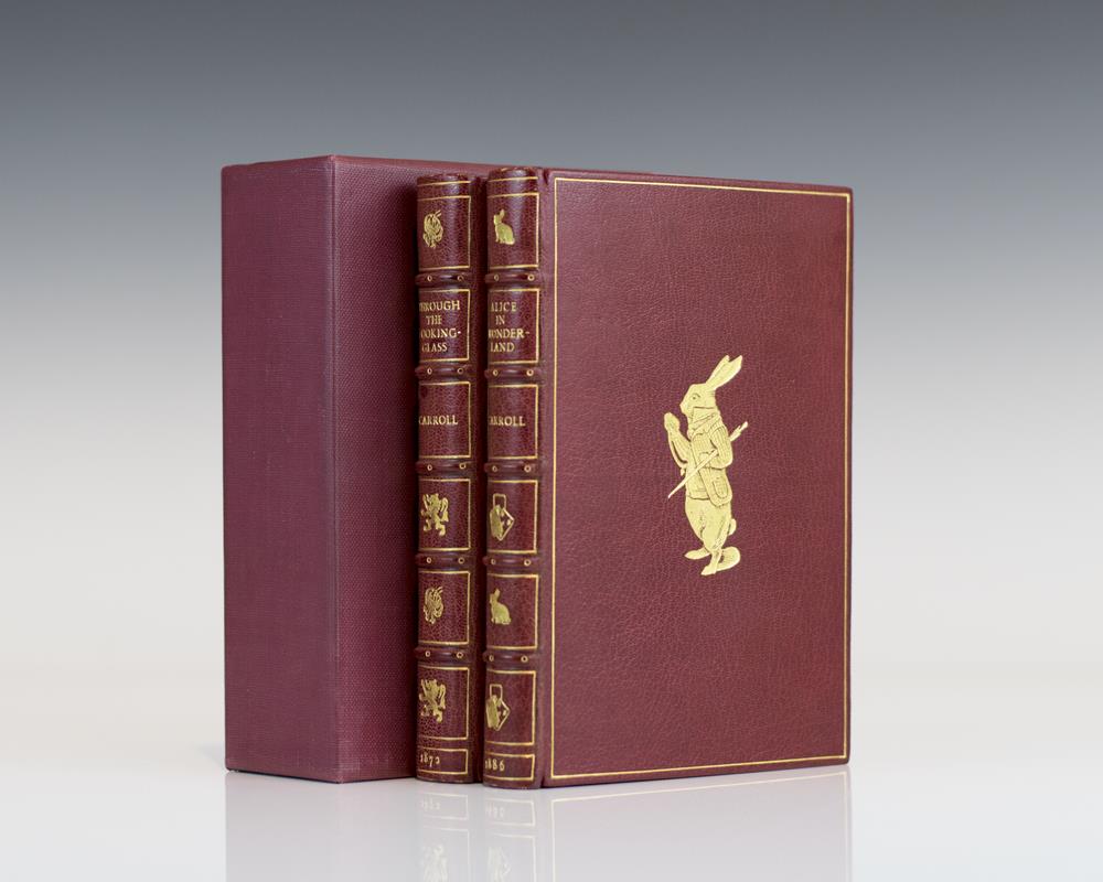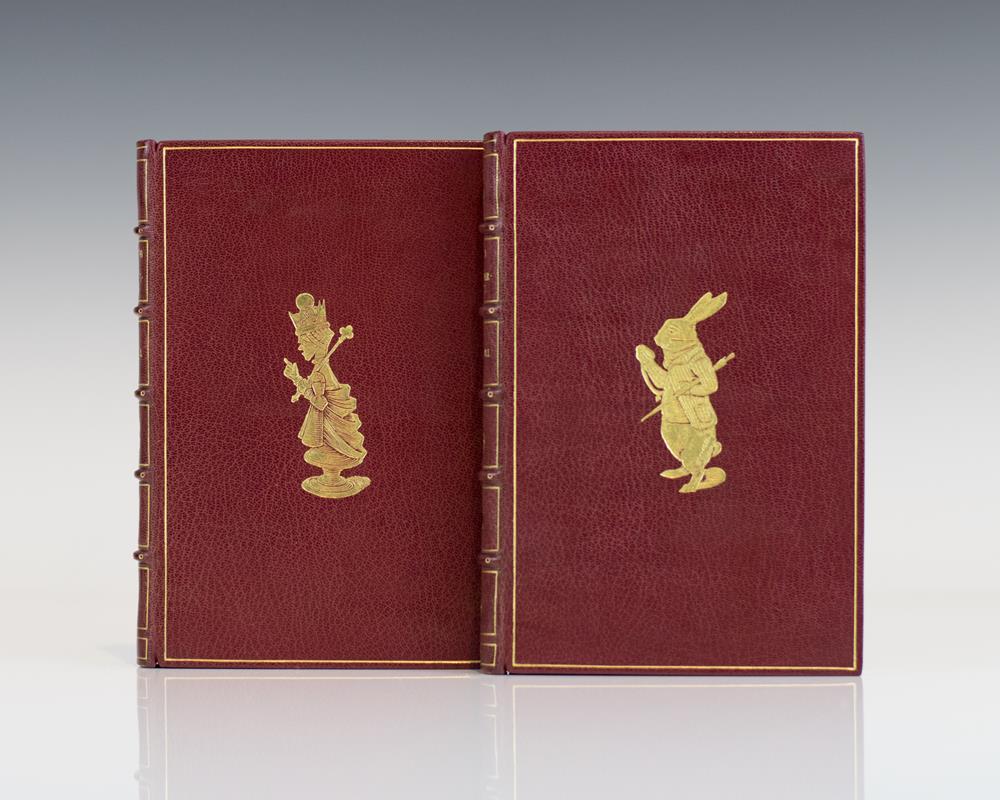 Octavo, bound by Bayntun Riviere in full crushed red morocco, all edges gilt, emblematic gilt spine compartments, raised bands, gilt turn-ins, gilt figure of the White Rabbit on the front cover of Alice, gilt figure of the Red Queen on front cover of Looking-Glass, original cloth covers and spines bound in. Cloth slipcase. Alice's Adventures in Wonderland is a later printing. Through the Looking-Glass and What Alice Found There is a first edition, first printing. Illustrated by John Tenniel, text illustrated. A stunning set.
