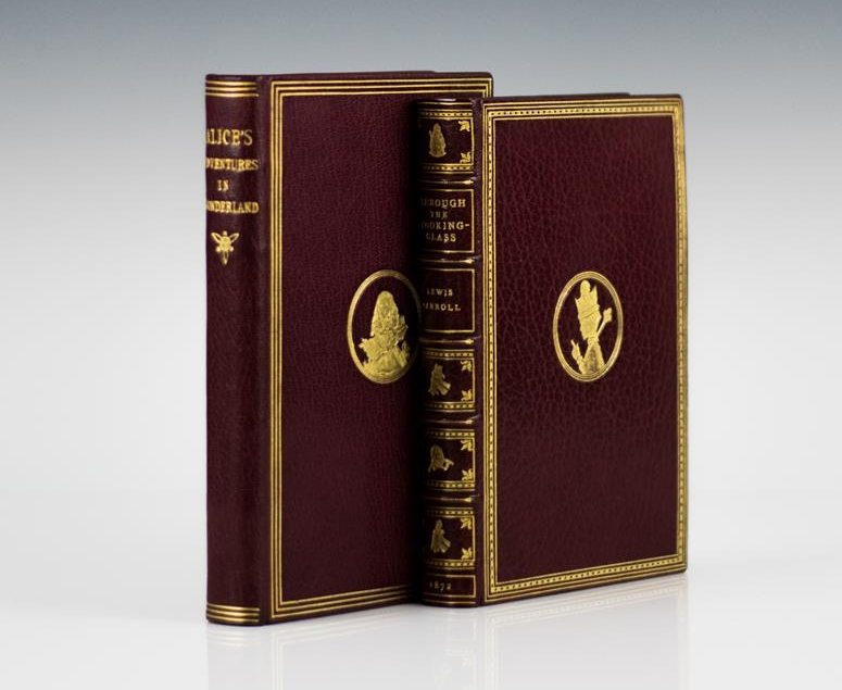 First editions of the author's classic work's Alice's Adventures In Wonderland and Through the Looking-Glass. Octavo, two volumes. Bound in early 20th-century full red morocco by Sangorski and Sutcliffe. Gilt vignettes to front and rear panels of each volume, gilt tooling on spine. All edges gilt, silk endpapers. Original cloth covers and spine bound in at rear. In fine condition. An attractive set.
