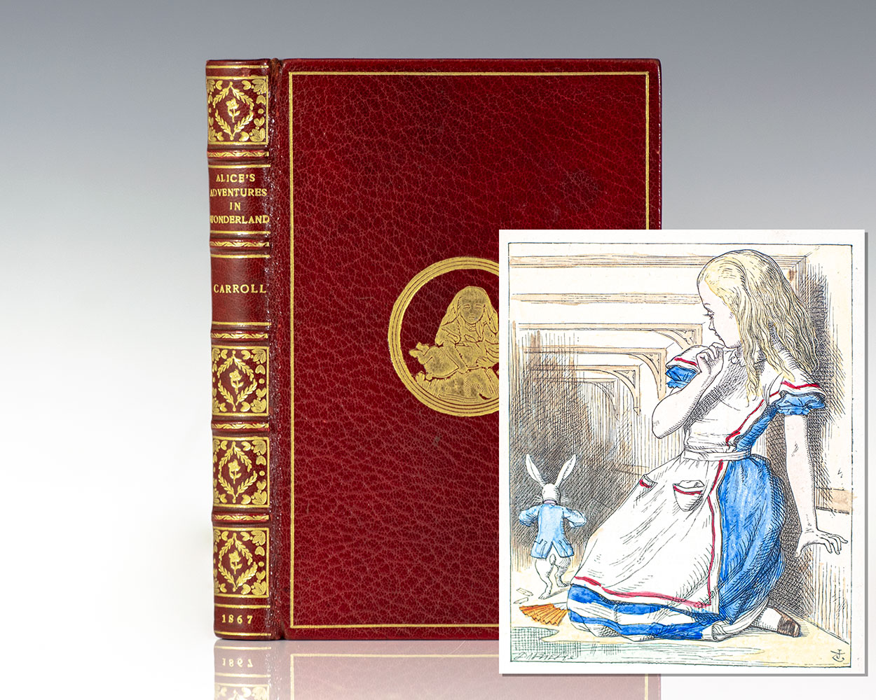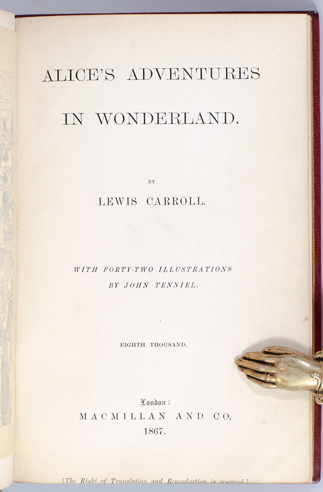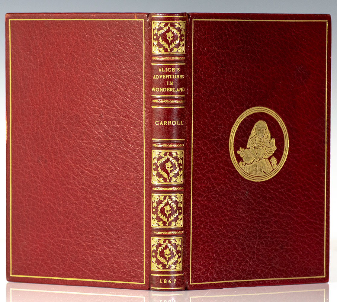 Finely bound early printing of Carroll's beloved children's classic. Octavo, bound in full 20th century scarlet crushed levant morocco by William Bennet, gilt titles and elaborate gilt tooling to the spine in six compartments within raised gilt bands, gilt ruling to the front and rear panels, central gilt ornament of Alice holding a rabbit to the front panel, gilt turn-ins and inner dentelles, all edges gilt, marbled endpapers, illustrated by John Tenniel, many with hand-coloring and including tissue-guarded frontispiece. In near fine condition. Bookplate and neat ownership name.