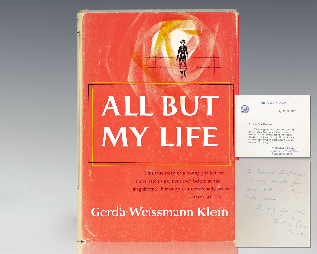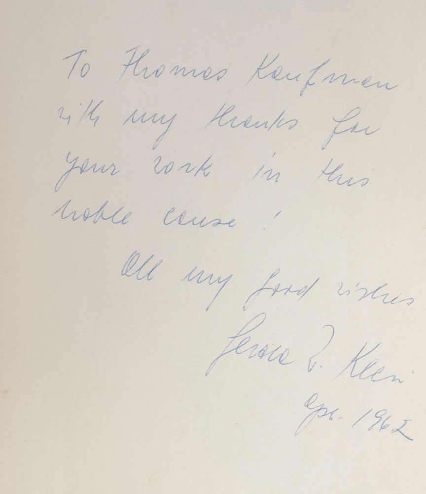 First edition of the author's "moving personal testament to courage" memoir. Octavo, original cloth, frontispiece. Presentation copy, inscribed by the author on the front free endpaper, "To Thomas Kaufman with thanks for your work in this whole course! All my good wished Gerda W. Klein Apr. 1962." With a letter from Ms. Klein's assistant stating that this has been sent to the recipient at the request of M. Weissman Klein. Near fine in a very good dust jacket. Jacket design by Leo Manso.
