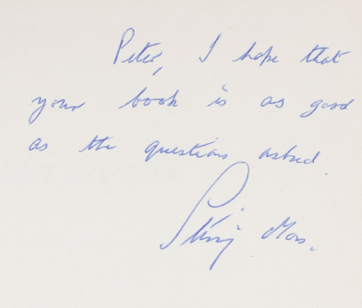 First edition of the racing legend's autobiography. Octavo, original cloth, illustrated. Presentation copy, lengthily inscribed by the author on the front free endpaper, "Peter, I hope that your book is as good as the questions asked. Stirling Moss." Near fine in a near fine dust jacket with light rubbing.