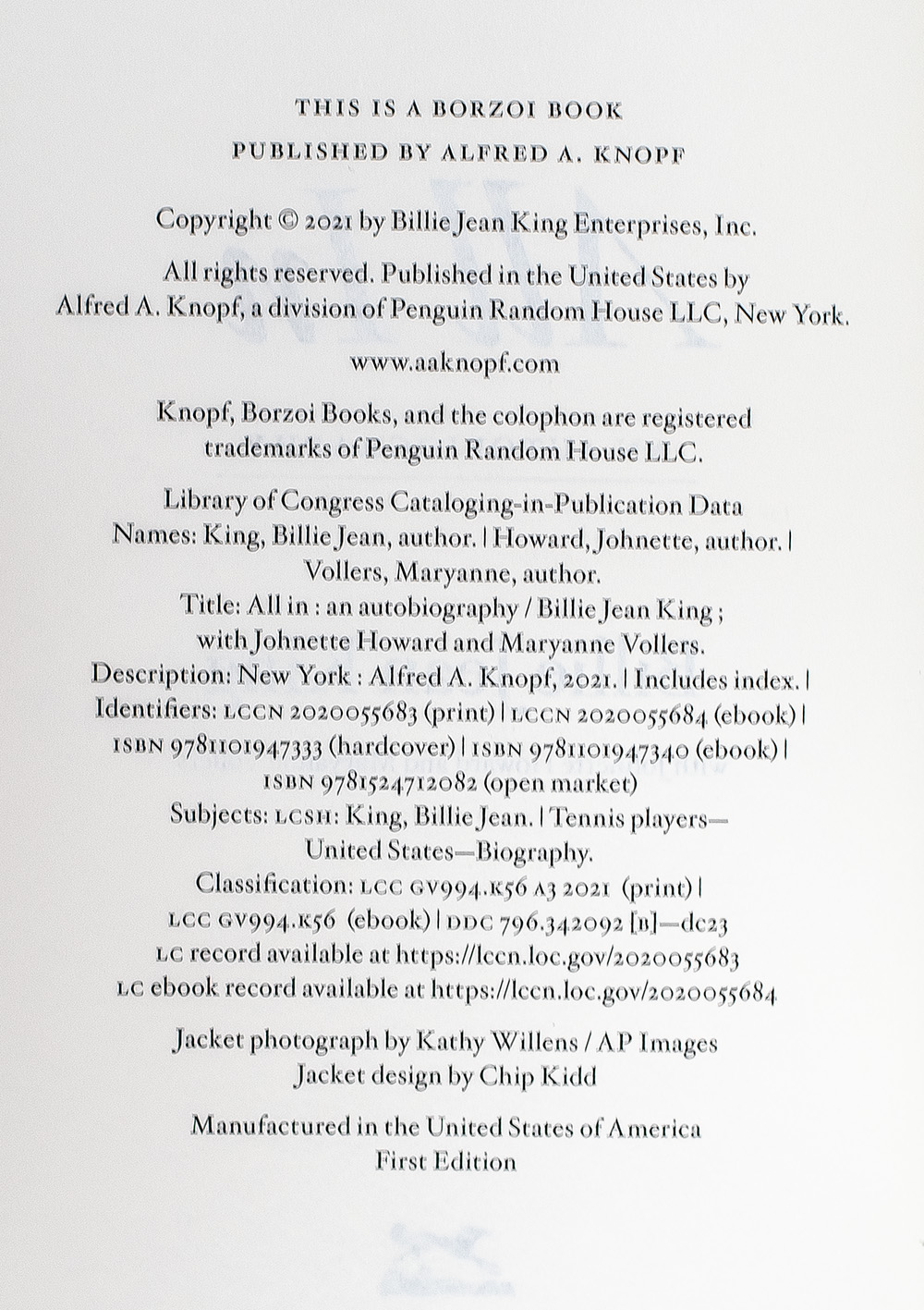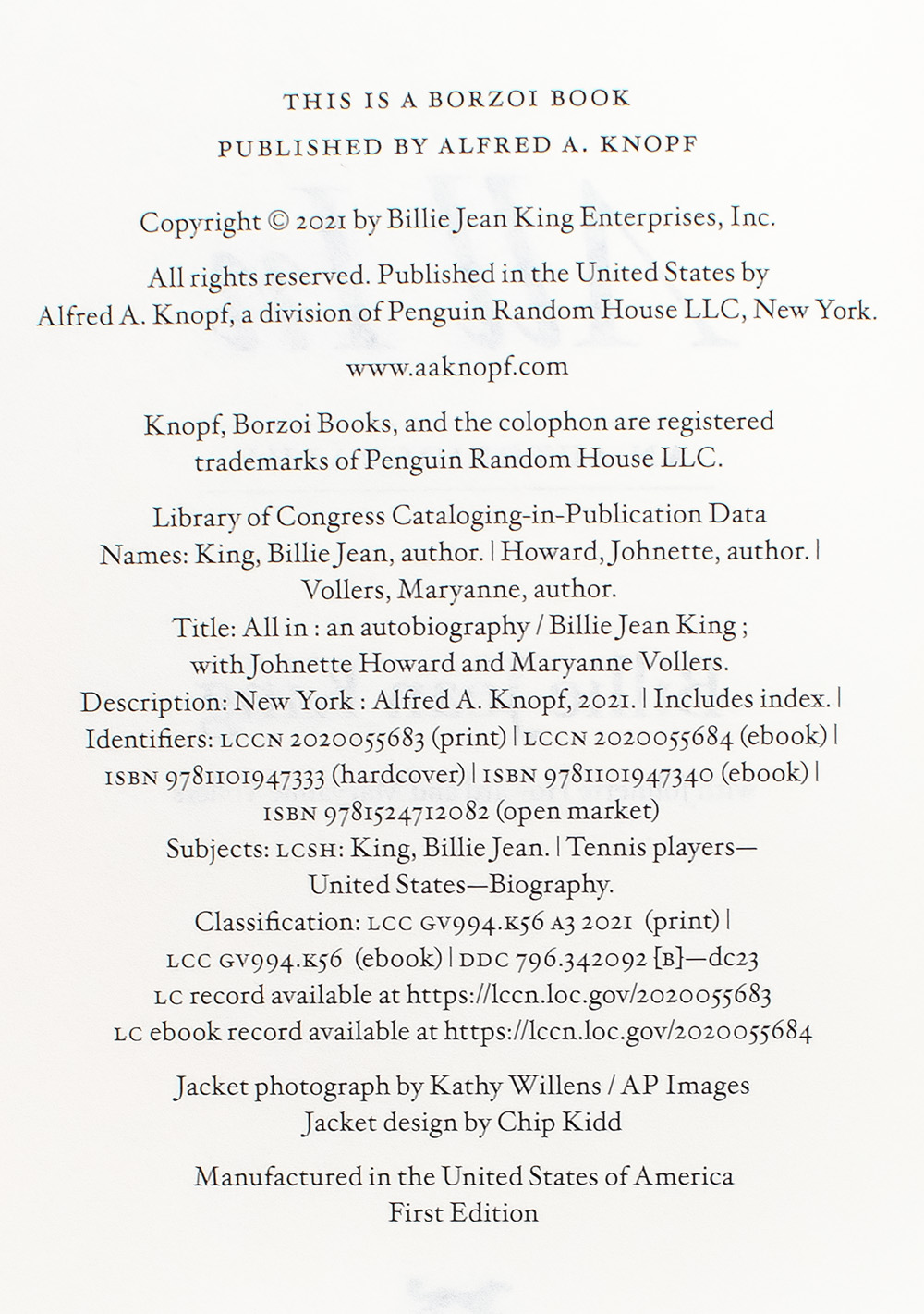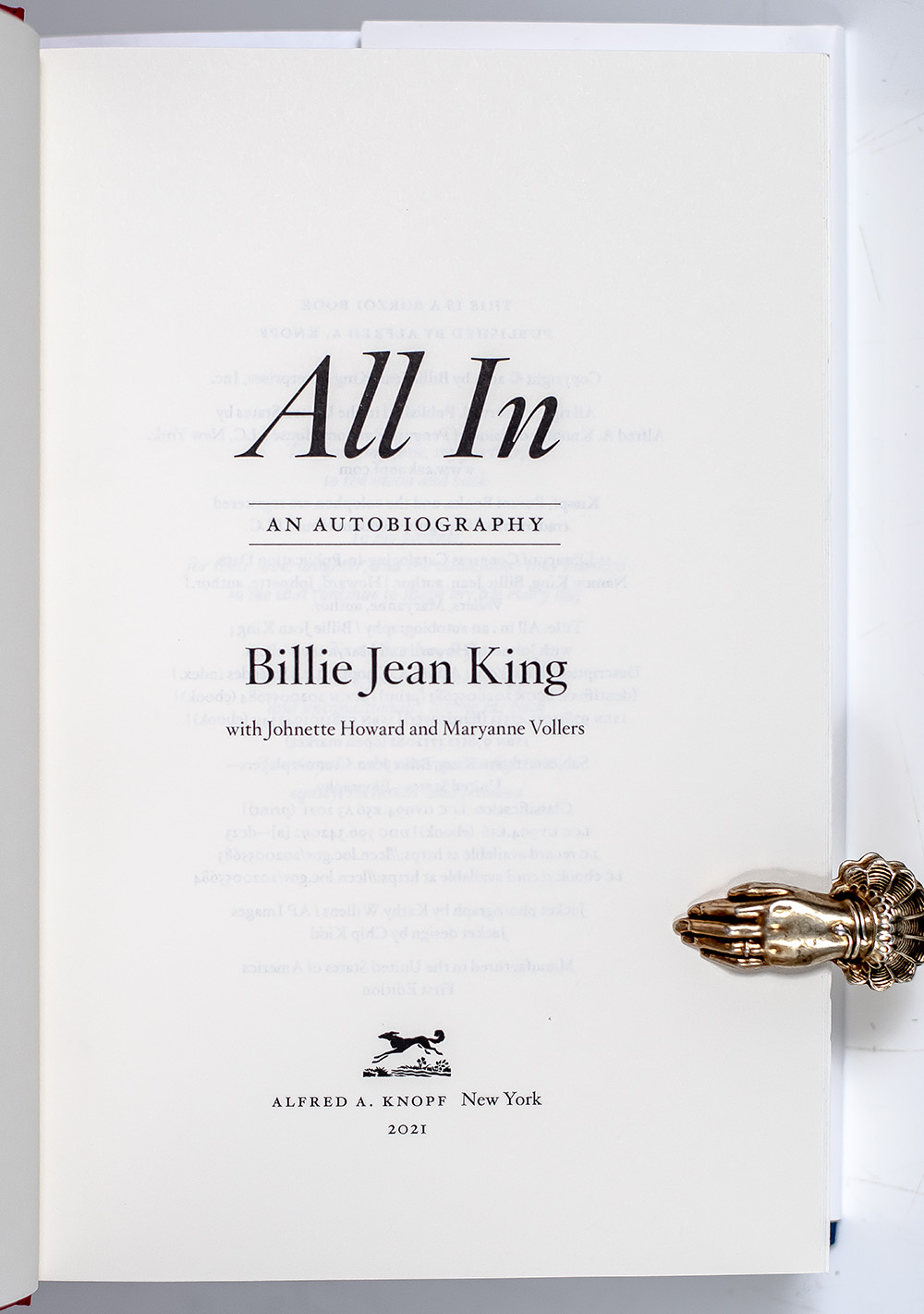 First Edition of Billie Jean King's All In: An Autobiography; Signed by Her and two times by Jacket illustrator Chip Kidd