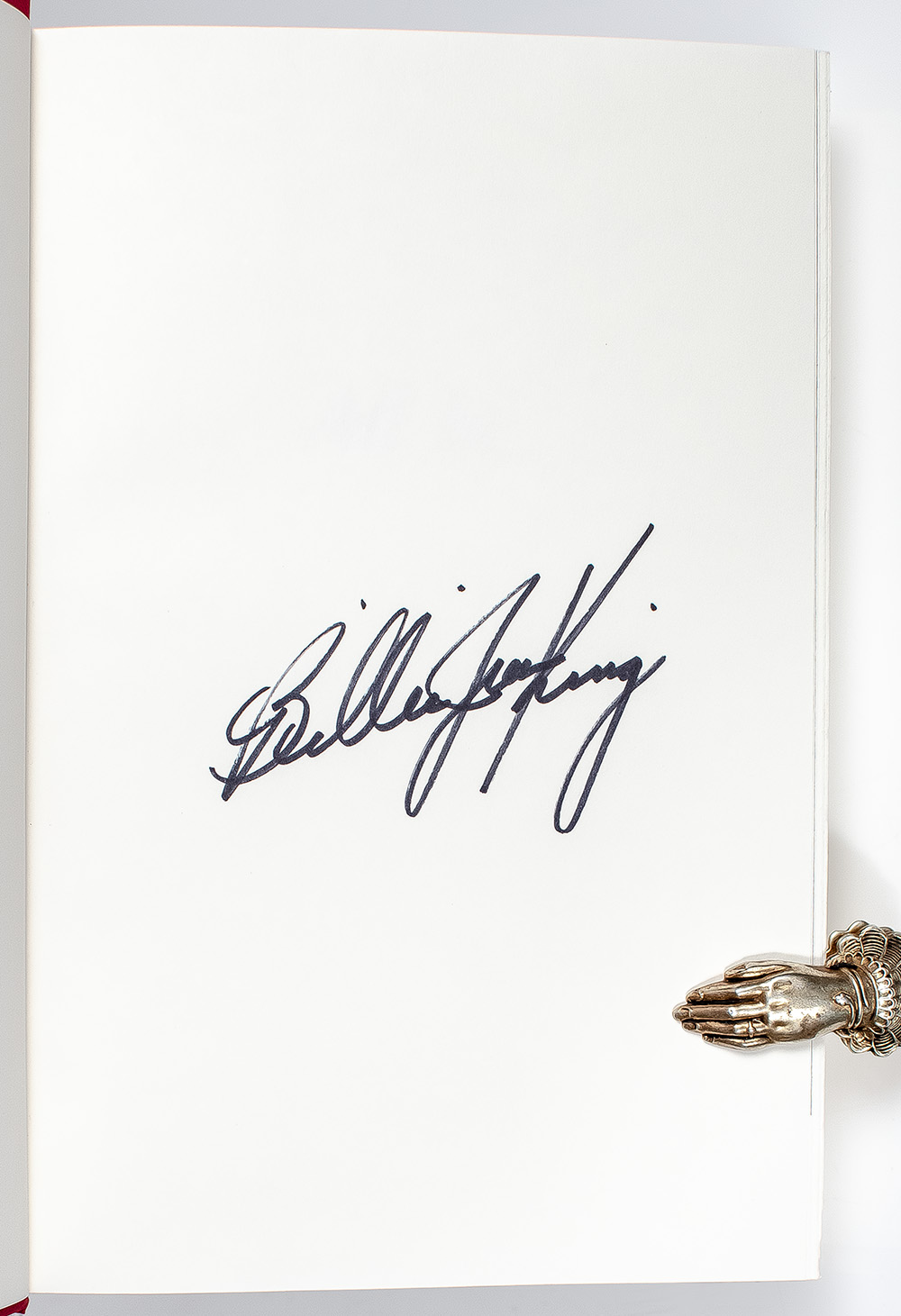 First edition of the tennis champion's autobiography. Octavo, original half cloth. Boldly signed by Billie Jean King and twice by jacket illustrator Chip Kidd, on the front panel and again on the rear panel. Fine in a fine dust jacket. Jacket design by Chip Kidd.