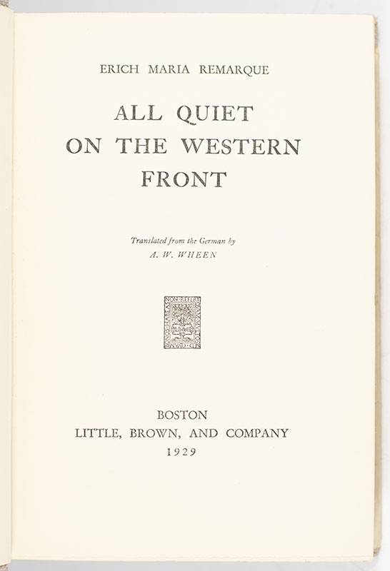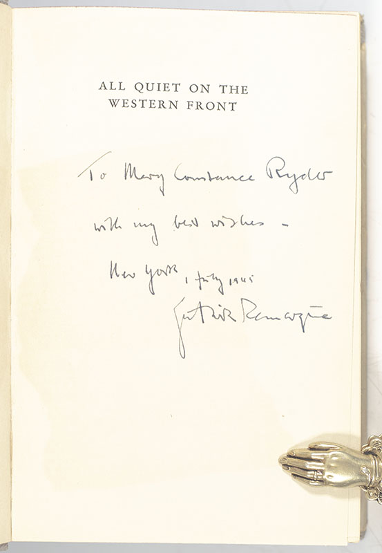 First American edition of this landmark novel of the 20th century. Octavo, original beige cloth. Presentation copy, inscribed by the author on the half-title page, To Mary Constance Ryder with my best wishes- New York July 1945 Eric Maria Remarque." Near fine in a very good dust jacket with a few small chips and light wear. Jacket design by Paul Wenck. Translated by A.W. Wheen. Housed in a custom half morocco clamshell box. Signed and inscribed first editions are rare.
