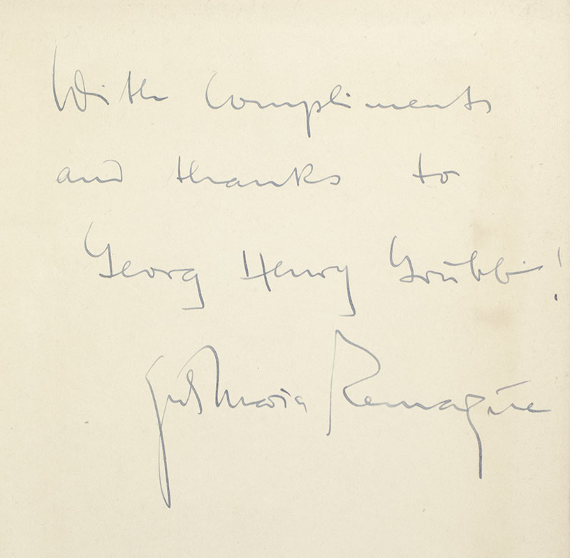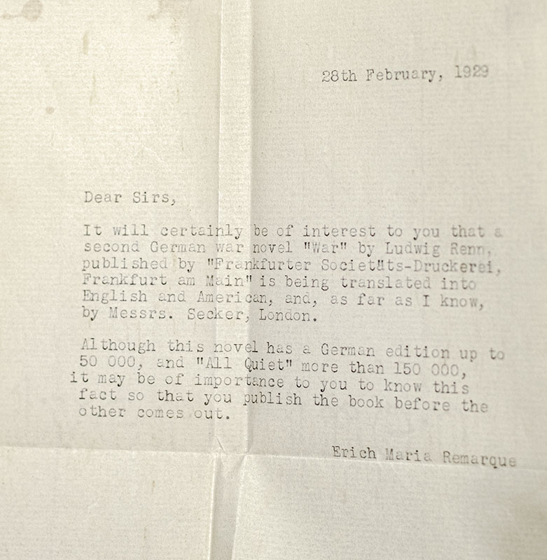 First edition in English of this landmark novel of the 20th century. Octavo, original cloth. Presentation copy, inscribed by the author on the front free endpaper, "With the compliments and thanks to Geor Henry Gribb! Erich Maria Remarque." With a type letter from the author dated in 28th February, 1929 from Remarque attached to the front pastedown. Near fine in a near fine dust jacket with light rubbing. With the original publisher's list and catalogues card laid in. Translated by A.W. Wheen. Housed in a custom half morocco clamshell box made by the Harcourt Bindery. Exceptionally rare and desirable signed and inscribed, with only one example appearing at auction in the last 90 years.