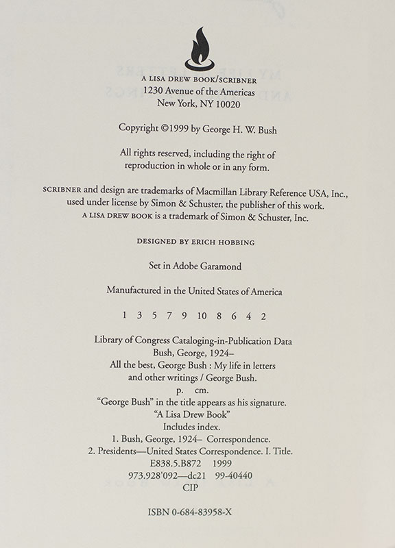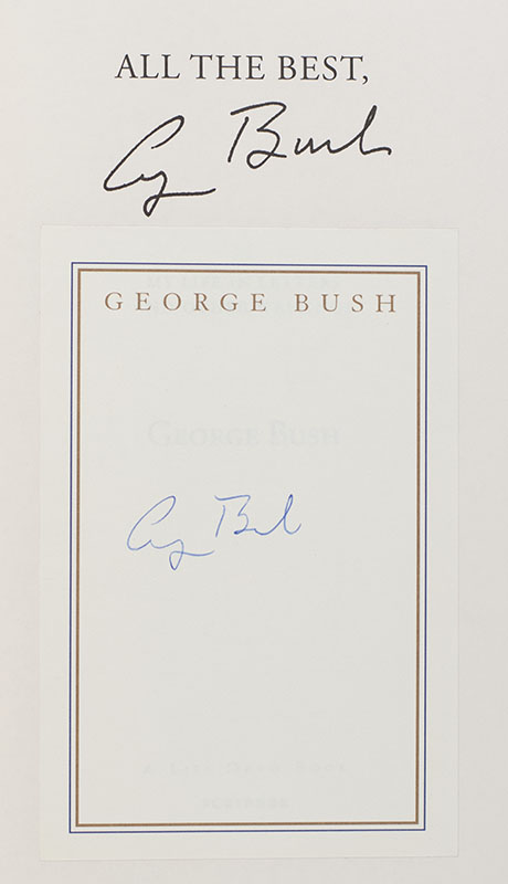 First edition of George H. W. Bush's life and letters. Octavo, original half cloth, illustrated. Signed by George Bush on an official bookplate. Fine in a fine dust jacket. Jacket design by John Fontana. Jacket photograph by Alexanders of Houston.