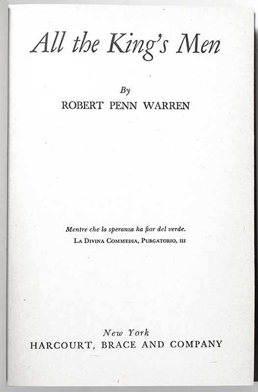 First edition, early printing of the author's Pulitzer Prize-winning work. Octavo, original cloth. Presentation copy, inscribed by Robert Penn Warren on the front free endpaper, "To William Safire all the best! Robert Penn Warren January 10, 1977." The recipient, William Safire, was an important American author, columnist, journalist, and presidential speechwriter. He joined Nixon's campaign for the 1960 Presidential race, and again in 1968. After Nixon's 1968 victory, Safire served as a speechwriter for him and Spiro Agnew. He authored several political columns in addition to his weekly column "On Language" in The New York Times Magazine from 1979 until the month of his death and authored two books on grammar and linguistics: The New Language of Politics (1968) and what Zimmer called Safire's "magnum opus," Safire's Political Dictionary. Safire later served as a member of the Pulitzer Prize Board from 1995 to 2004 and in 2006 was awarded the Presidential Medal of Freedom by President George W. Bush. Near fine in the second state dust jacket which is in very good condition with the $3.00 price present.