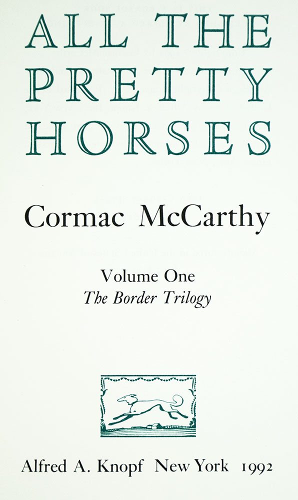 First edition of the first novel in McCarthy's acclaimed Border Trilogy and winner of the National Book Award. Octavo, original half cloth. Signed by Cormac McCarthy on the half-title page. Fine in a fine dust jacket. Jacket design by Chip Kidd.