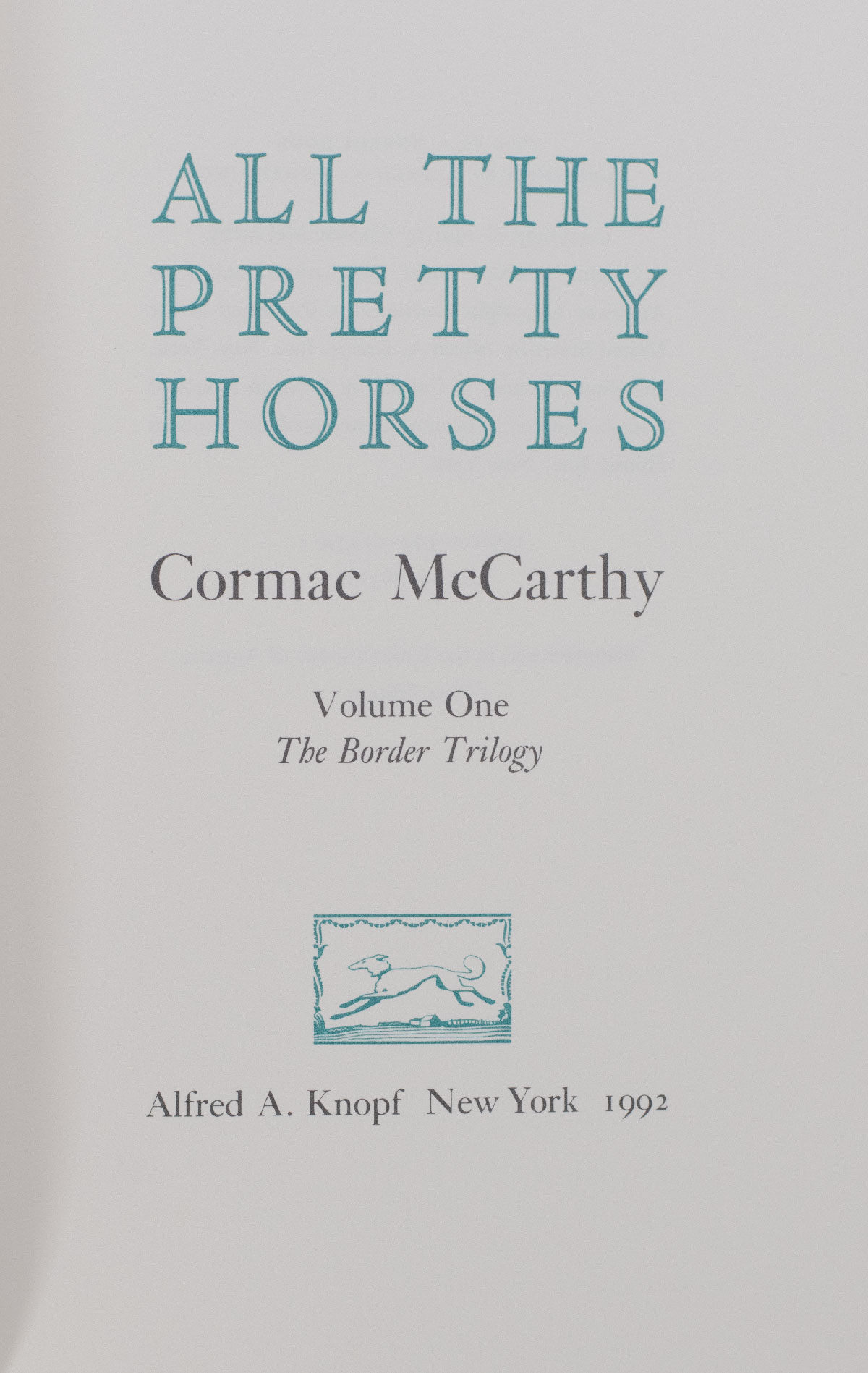 First edition of the first novel in McCarthy's acclaimed Border Trilogy and winner of the National Book Award. Octavo, original half cloth. Boldly signed by Cormac McCarthy on the front free endpaper and additionally signed three times by jacket designer Chip Kidd, once on the front panel, on the half-title and on the rear flap. Fine in a fine dust jacket. Jacket design by Chip Kidd.