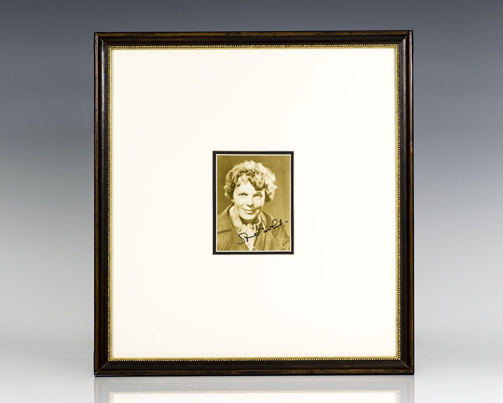 Original photograph of Amelia Earhart, boldly signed by her. The photograph measures The entire piece measures 11.5 inches by 12.5 inches.