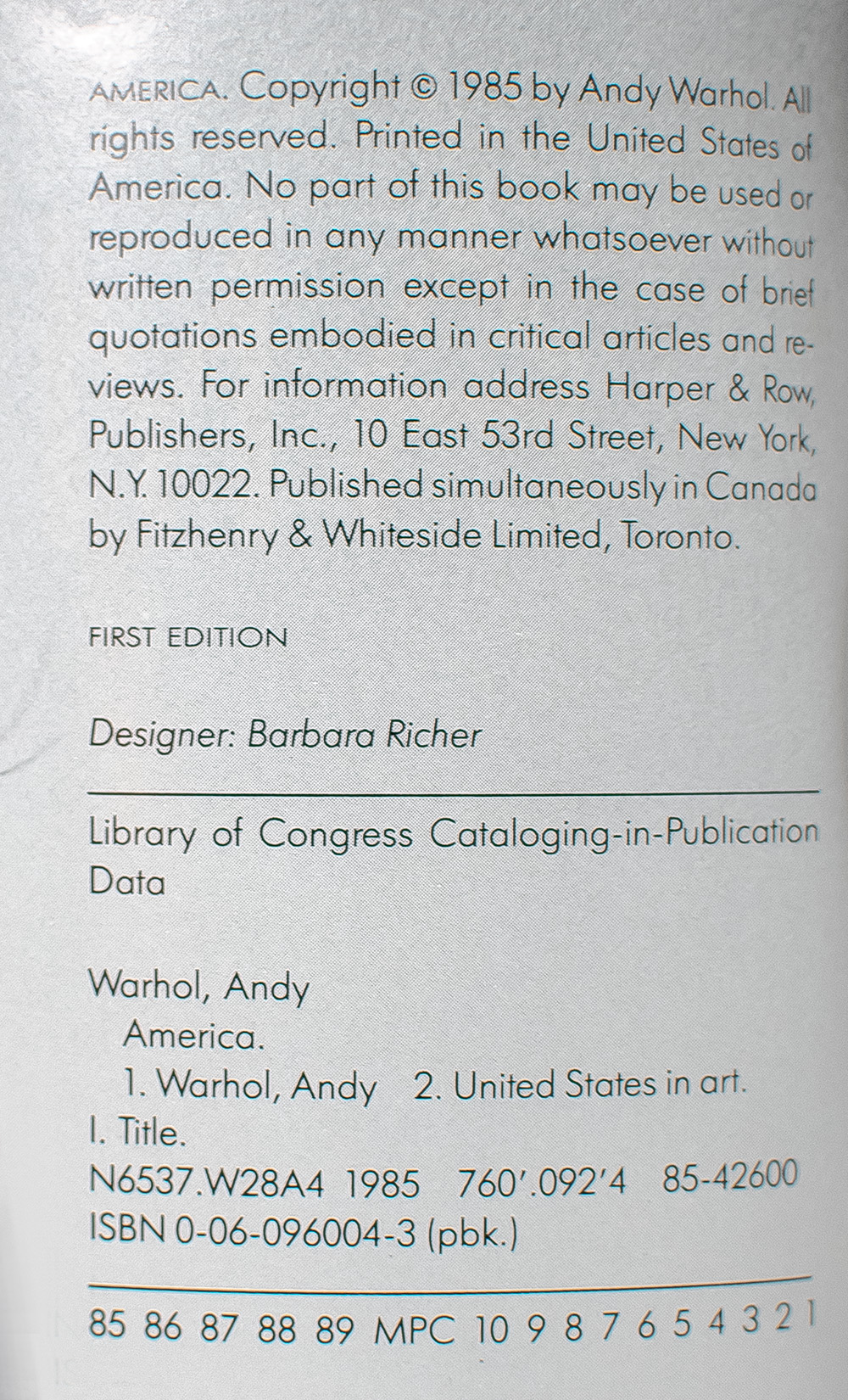 First paperback printing of this photographic study of America in the eighties. Quarto original wrappers. Boldly signed by Andy Warhol on the front panel. In fine condition. Designed by Barbara Richter.