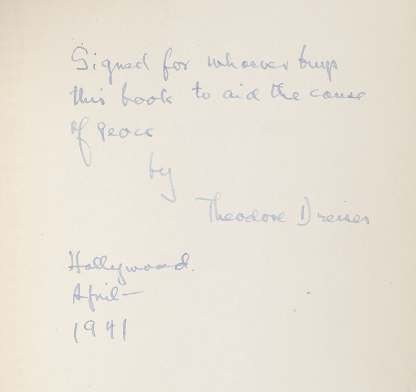 First edition, second printing of this work by the author of Carrie. Octavo, original cloth. Presentation copy, inscribed by the author on the front free endpaper in the year of publication, "Signed for whoever buys this book to aid the cause of peace by Theodore Dreiser Hollywood. April- 1941." Near fine in a very good dust jacket.