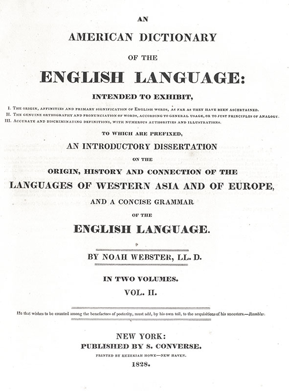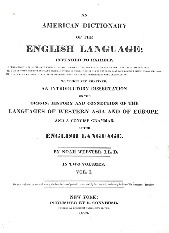 In 1807 Webster began compiling a fully comprehensive dictionary, An American Dictionary of the English Language; it took twenty-eight years to complete. To evaluate the etymology of words, Webster learned twenty-six languages, including Old English (Anglo-Saxon), Greek, Hebrew and Latin. Webster completed his dictionary during his year abroad in 1825 in Paris, France, and at the University of Cambridge. His book contained seventy thousand words, of which twelve thousand had never appeared in a published dictionary before. As a spelling reformer, Webster believed that English spelling rules were unnecessarily complex, so his dictionary introduced American English spellings, replacing colour with color, substituting wagon for waggon, and printing center instead of center. He also added American words, like skunk and squash, that did not appear in British dictionaries. At the age of seventy, Webster published his dictionary in 1828, registering the copyright on April 14. Webster did all this in an effort to standardize the American language. “This dictionary, which almost at once became, and has remained, the standard English dictionary in the United States, was the end-product of a stream of spelling books, grammars, readers, and dcitionaries which flowed from the pen of the industrious Noah Webster....Webster’s great dictionary, all the 70,000 entries of which he wrote with his own hand, has been reprinted and brought up to date innumerable times....the book marked a definite advance in modern lexicography, as it included many non-literary terms and paid great attention to the language actually spoken. Moreover, his definitions of the meaning of words were accurate and concise...and have for the greater part stood the test of time superbly well” (Printing and the Mind of Man). "As a whole, Webster’s American Dictionary was a scholarly achievement of the first order, richly deserving of its great reputation at home and abroad” (DAB). With definitions for “some 70,000 words—15,000 more than any previous English lexicon… Although only 2500 copies of the first edition were printed, the work established Webster as a lexicographer of international repute” (Lathem, 76 United Statesiana 9).