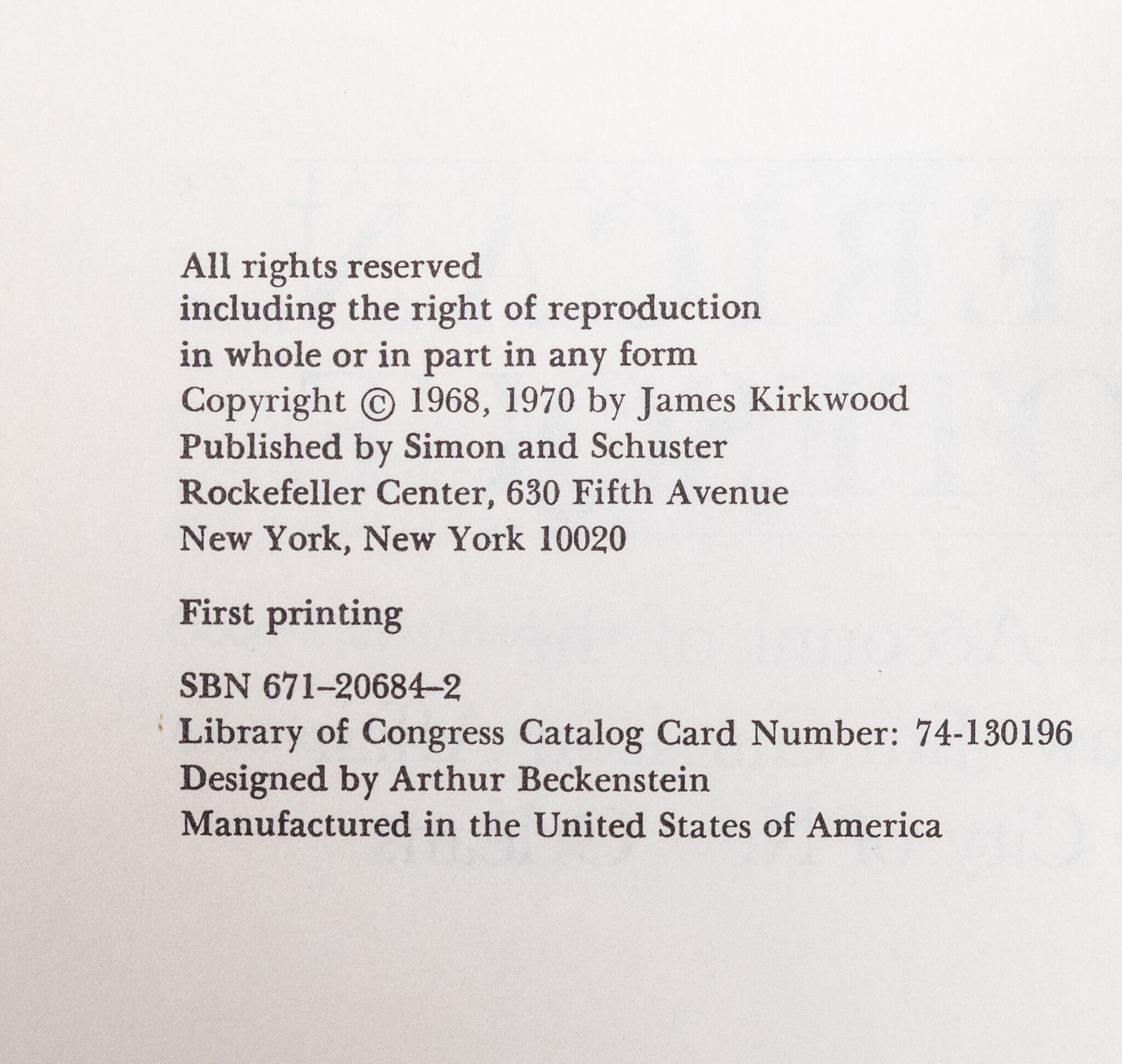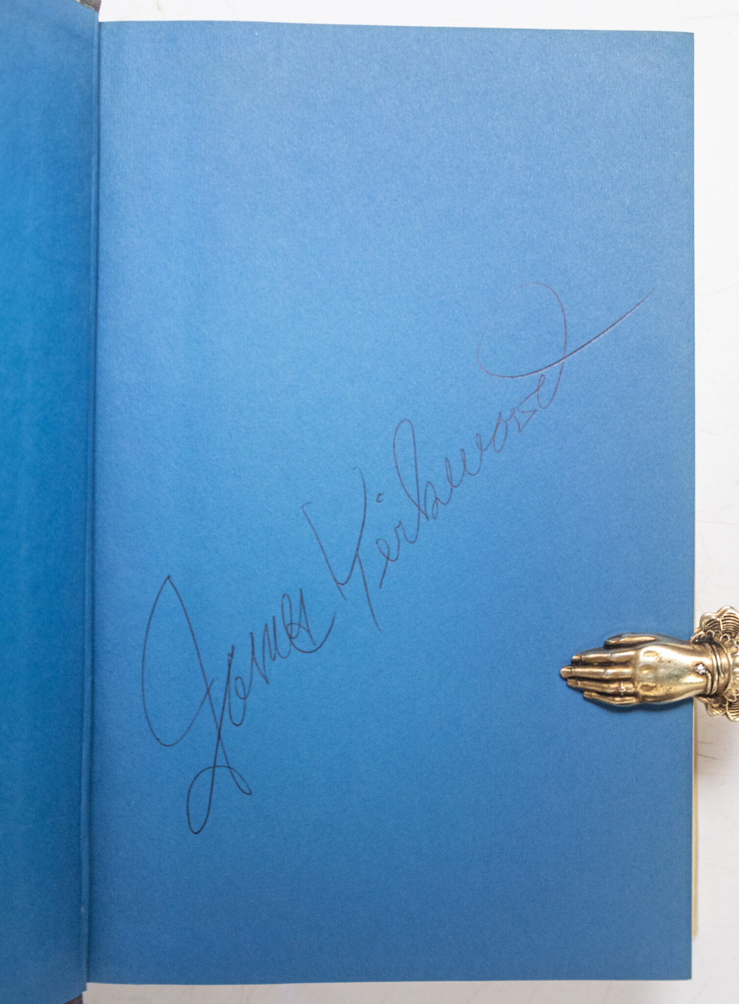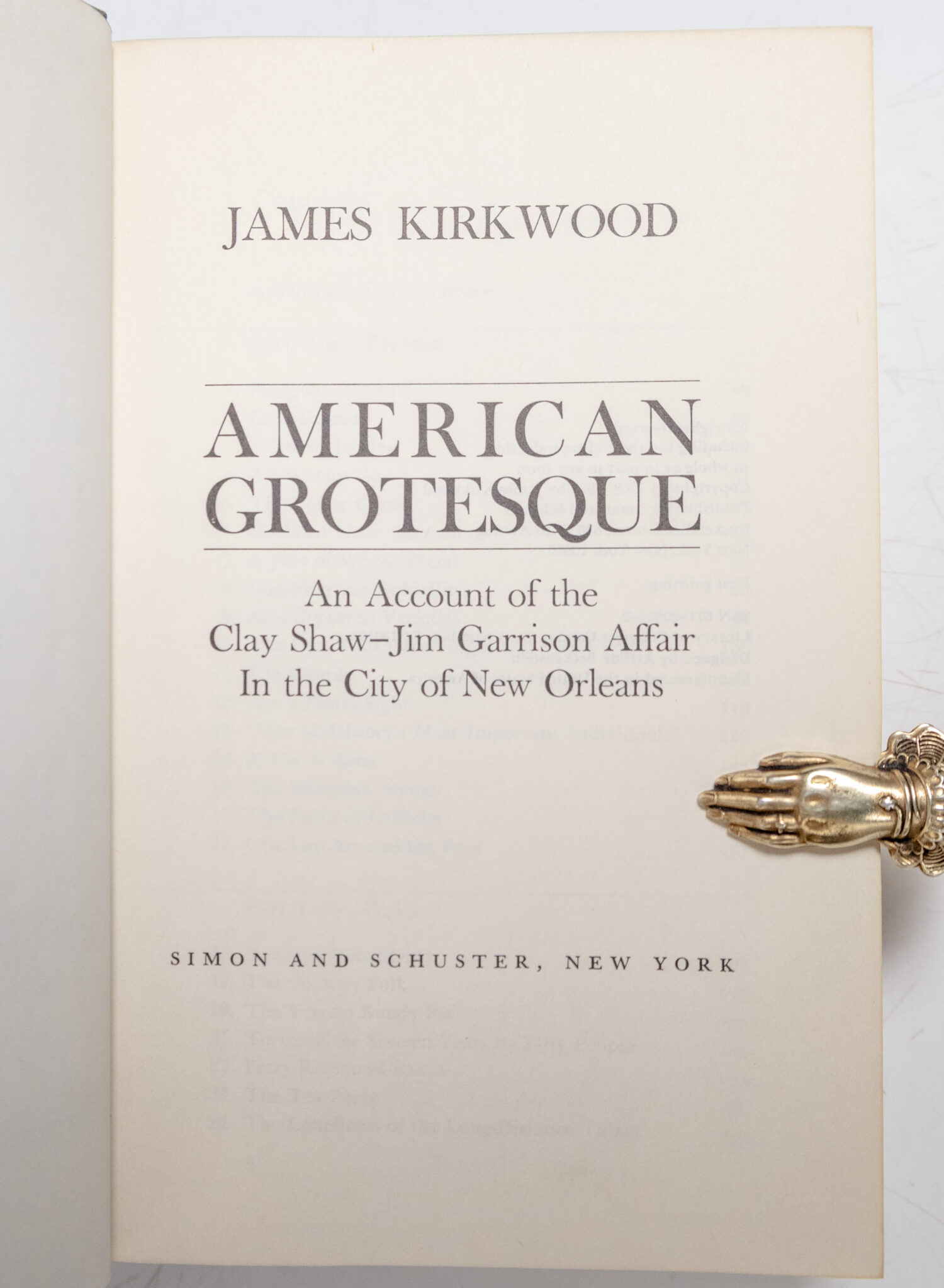 First edition of this detailed journalistic account of the investigation and trial conducted by New Orleans DA Jim Garrison against businessman Clay Shaw. Octavo, original publisher's half cloth, top stain blue, illustrated with black and white photographs. Boldly signed by James Kirkwood on the front free endpaper. Fine in a very good dust jacket. Jacket design by Lawrence Ratzkin. Author photograph by Arthur Beckenstein. Rare signed.