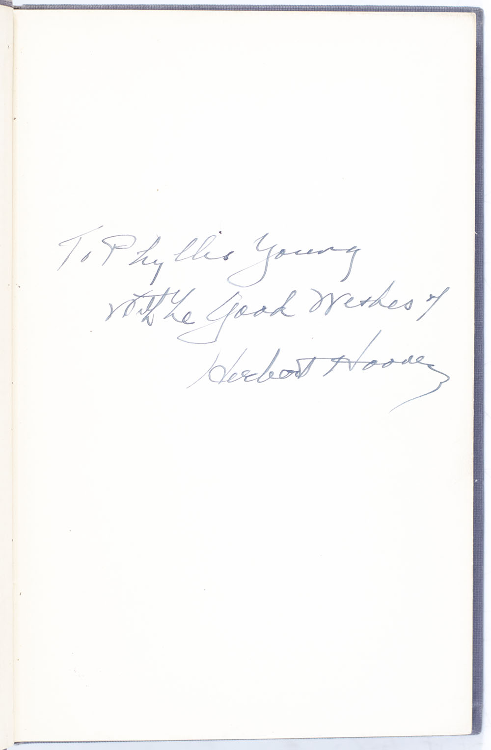 First edition of Hoover's tract on American individualism. Octavo, original cloth. Presentation copy, inscribed by the author on the front free endpaper, "To Phyllis Young with the good wishes of Herbert Hoover." In near fine condition.