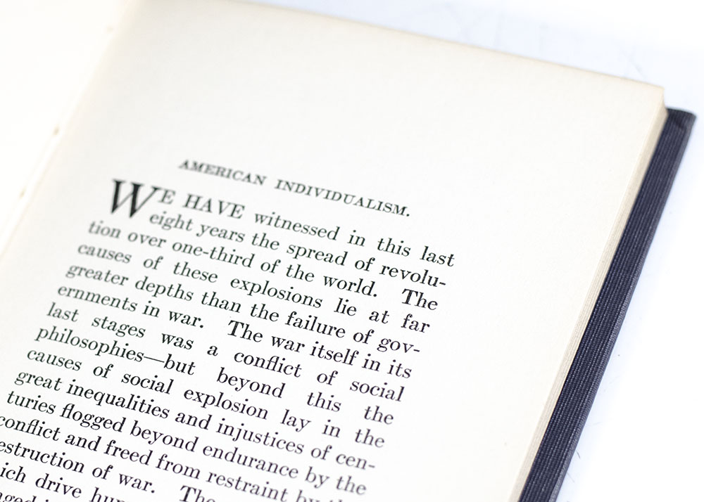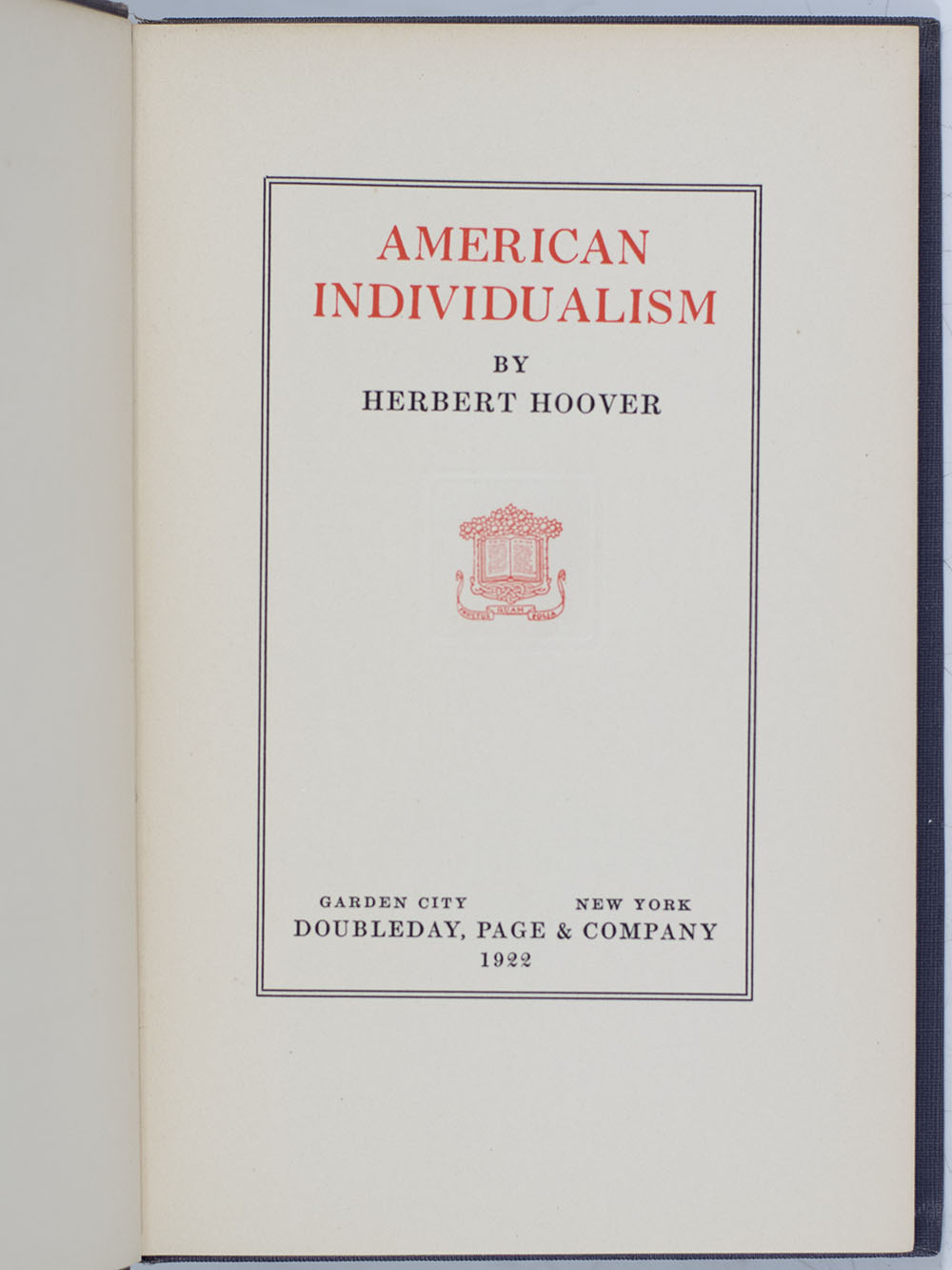 On publication, reviewers praised American Individualism as a work that ranks "among the few great formulations of American political theory" (New York Times). Published while serving as President Harding’s Secretary of Commerce, this important early work by President Herbert Hoover represented, to historian Frederick Jackson Turner, clear "evidence of a mind seeking to adapt pioneering traditions to the problems of an industrial and urban age" (Hawley, 3).