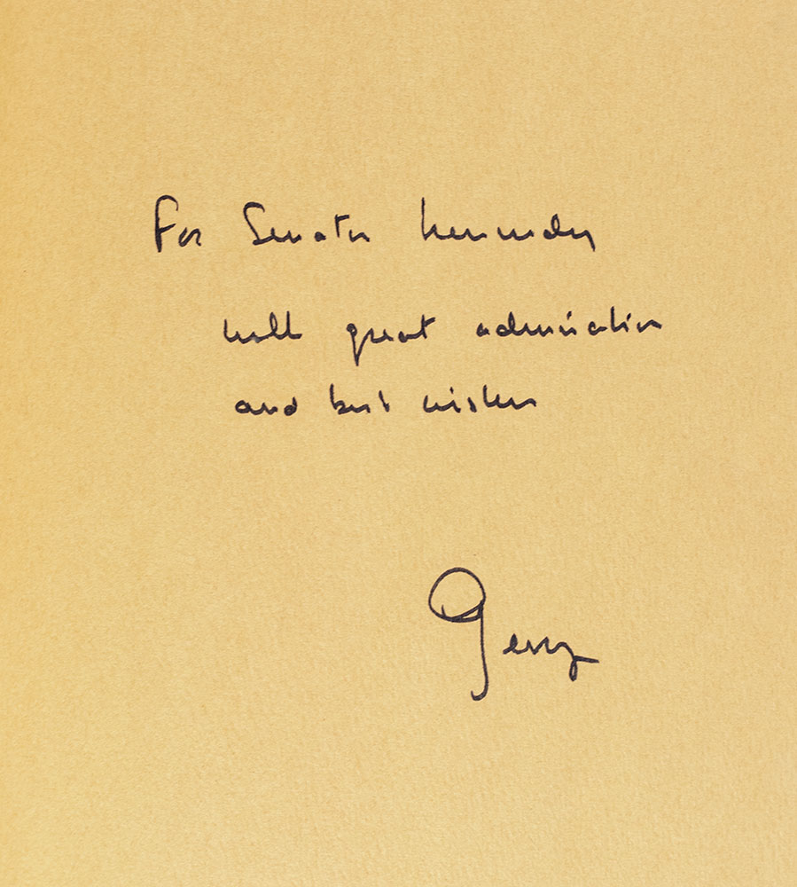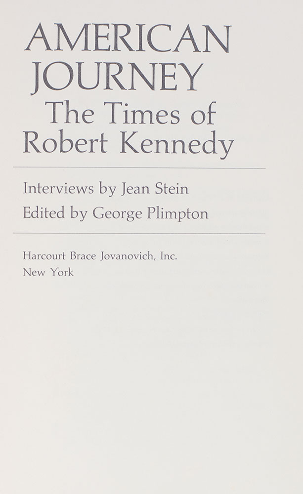 First edition of this remarkable biography of Robert F. Kennedy, based on interviews by Jean Stein and edited by George Plimpton. Octavo, original cloth. Association copy, inscribed by George Plimpton on the front free endpaper to Robert Kennedy's youngest brother, Ted Kennedy, "To Senator Kennedy with great admiration and best wishes, George." The recipient, Ted Kennedy served as a United States senator from Massachusetts for almost 47 years, from 1962 until his death in 2009. A member of the Democratic Party and the prominent political Kennedy family, he was the second most senior member of the Senate when he died. During his tenure, Kennedy became one of the most recognizable and influential members of his party and was sometimes called a "Democratic icon"as well as "The Lion of the Senate." Kennedy and his Senate staff authored around 2,500 bills, of which more than 300 were enacted into law. Very good in a good dust jacket. Jacket design by Hal Siegel. An exceptional association.