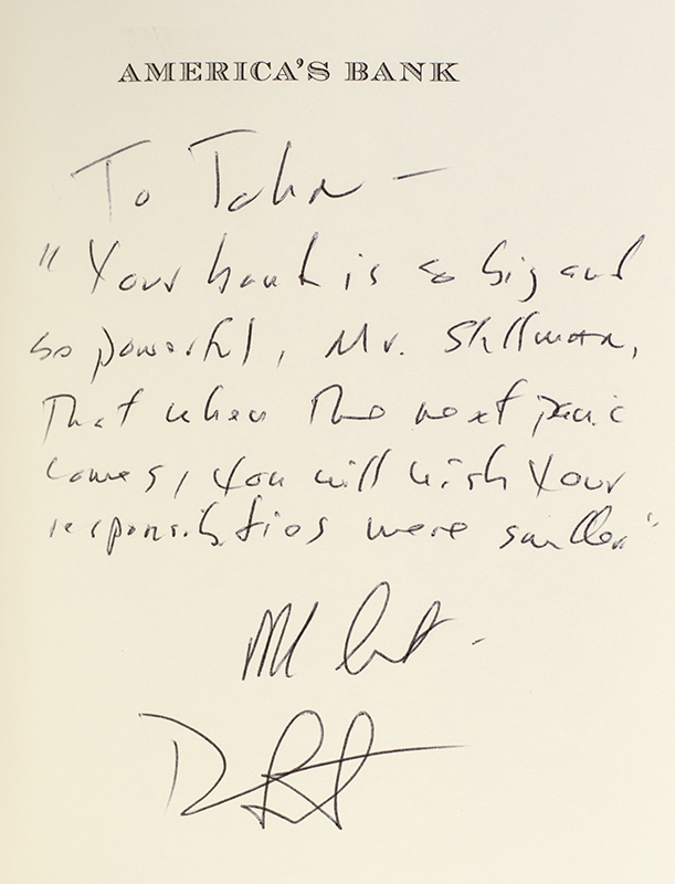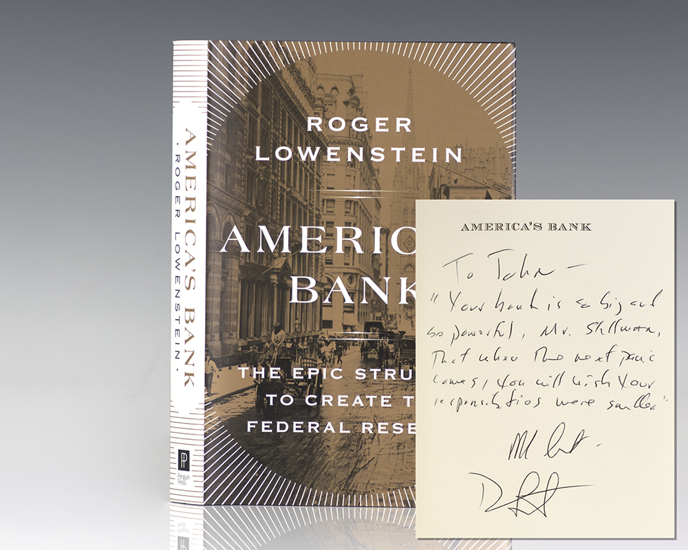 "Your bank is so big and so powerful, Mr. Shillman that when the next panic comes, you will wish your responsibilities were smaller": First Edition of Roger Lowenstein's America's Bank: The Epic Struggle to Create the Federal Reserve; Lengthily Inscribed by him