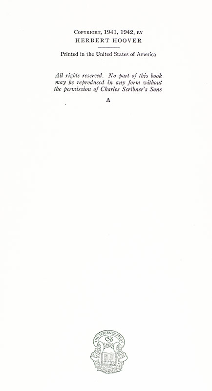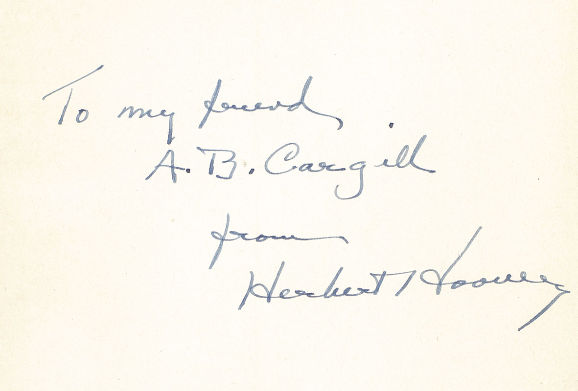 First edition of Hoover's look at the impact of World War I. Octavo, original gray cloth. Presentation copy, inscribed by the author on the front free endpaper in the year of publication, "To my good friend A.B. Cargill from Herbert Hoover Jan. 5/42." Near fine in a very good dust jacket.