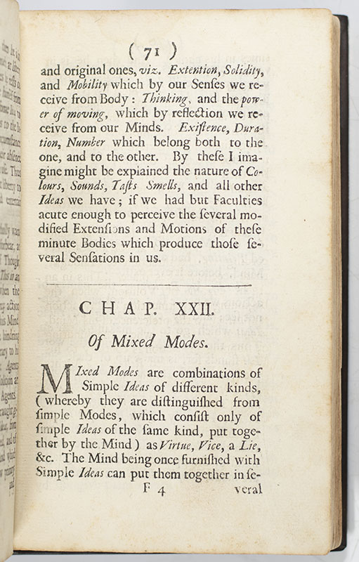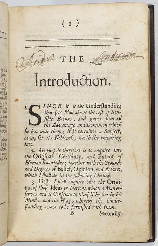 "Locke was the first to take up the challenge of Bacon and to attempt to estimate critically the certainty and the adequacy of human knowledge when confronted with God and the universe" (PMM 164). "The Essay Concerning Humane Understanding… was the first attempt on a great scale, and in the Baconian spirit, to estimate critically the certainty and the adequacy of human knowledge" (Fraser). "Locke's philosophy has not only had a profound effect upon philosophical and political thought, but also laid the foundations of modern psychology, dominating the field until well into the 19th century" (Norman). "The importance of few philosophical books have been so quickly recognized as was the case with the present [Essay Concerning Humane Understanding]. It passed through many editions in English and has several times been translated" (Pforzheimer).