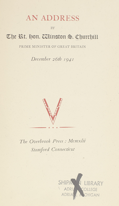 An Address by The Rt. Hon Winston S. Churchill Prime Minister of Great Britain December 26th 1941.