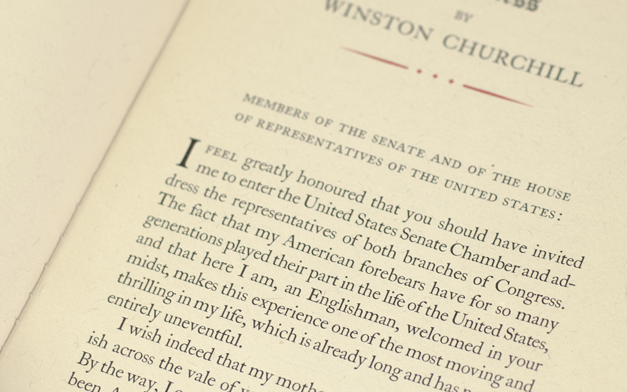 Rare first edition of Churchill's historic address delivered before Congress on December 26th 1941. Octavo, original boards. One of on thousand copies printed. In very good condition.