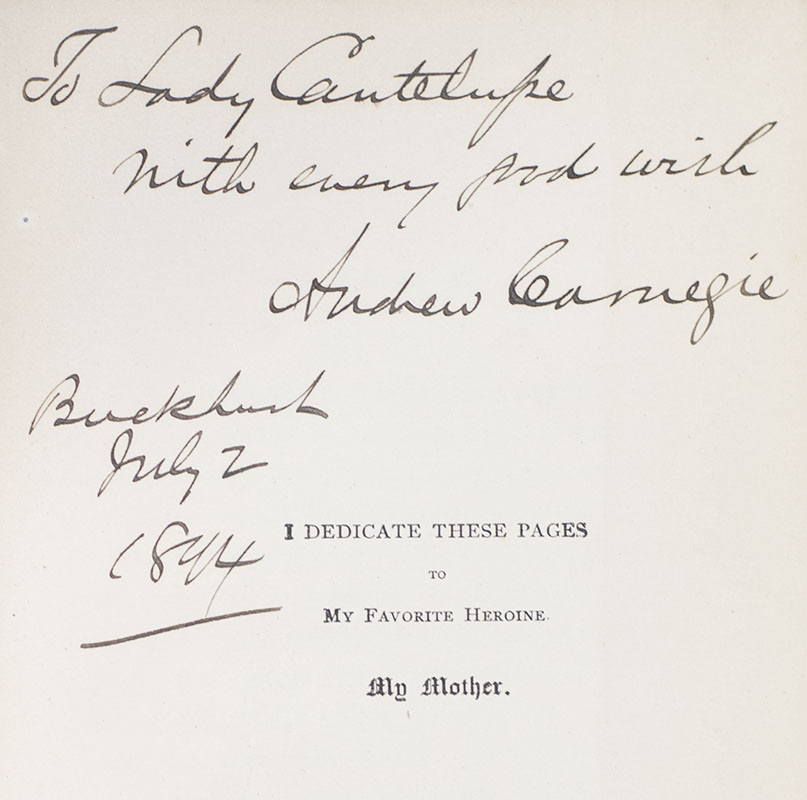 Early printing of this work by the steel magnate. Octavo, original cloth. Presentation copy, inscribed by the author on the dedication page, "To Lady Cantelupe, with every good wish, Andrew Carnegie, Buckhurst, July 2, 1894." In near fine condition.
