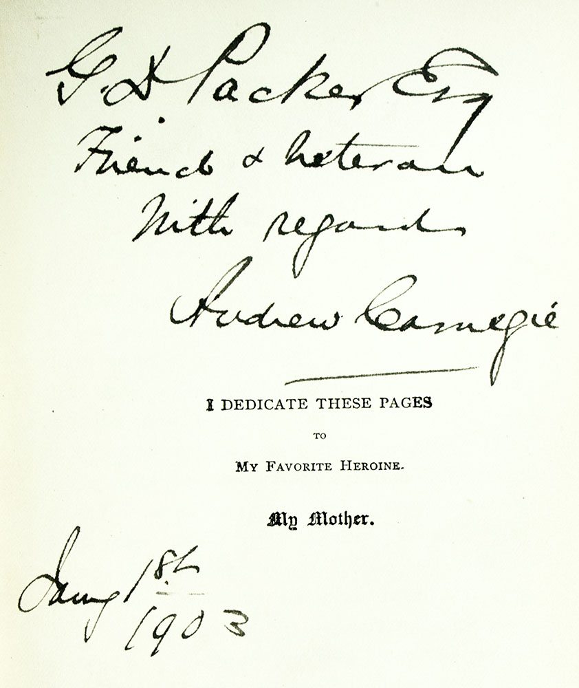 Octavo, original cloth. Association copy, inscribed by the author to his attorney on the dedication page, "G[ibson] D[avid] Packer Esq  Friend & Veteran With regards Andrew Carnegie January 18, 1903." The recipient G.D. Packer took charge of the legal department in the 1880's of the Carnegie Steel Company, continuing until after their merger with the United States Steel Corporation. He was a close associate and friend of Carnegie's. In very good condition. A nice association.