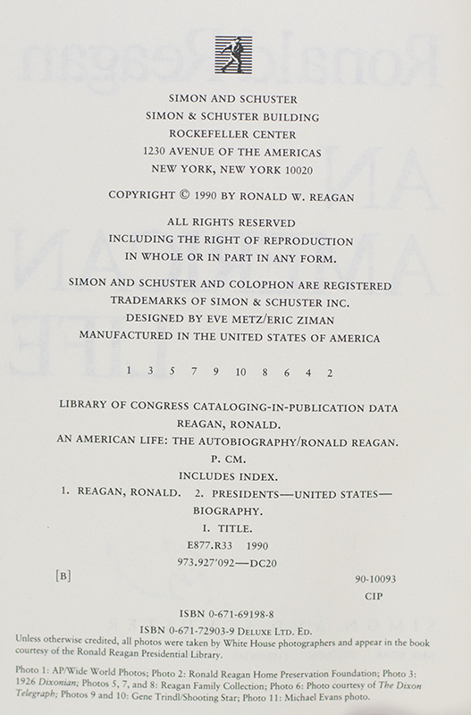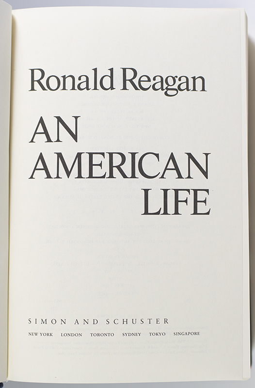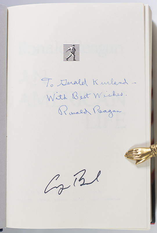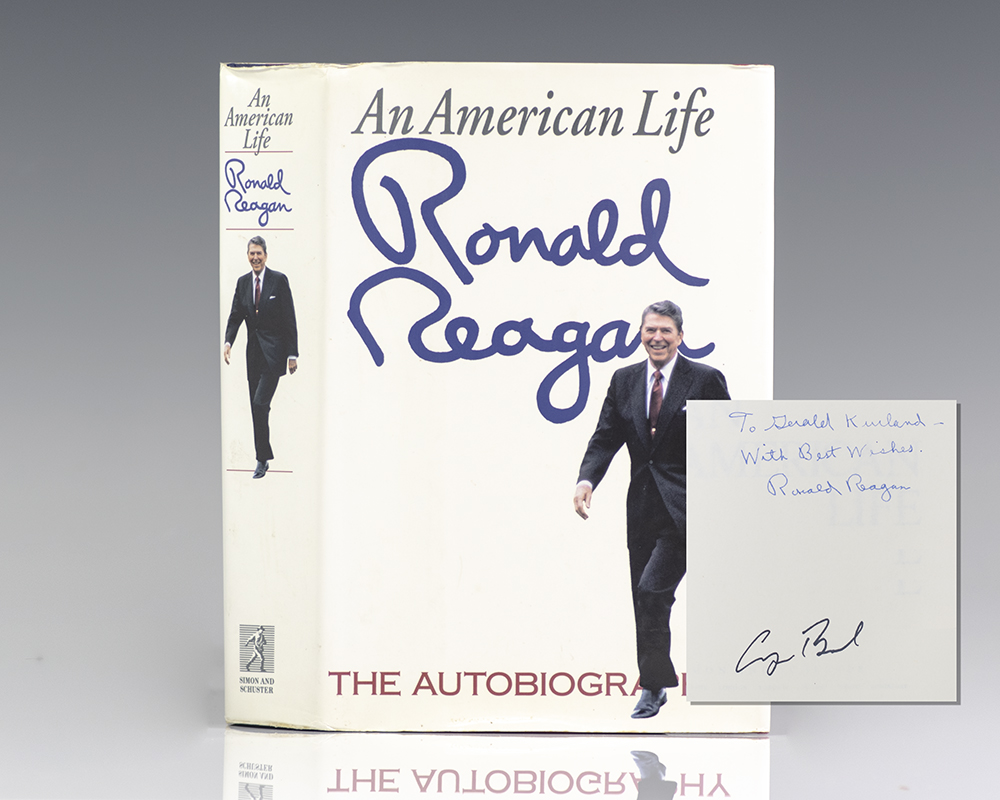 First edition of the 40th President of the United States' memoir. Octavo, original half cloth, illustrated. Presentation copy, inscribed by the author on the half-title page, "To Gerald Kurland- With Best Wishes Ronald Reagan" and additionally signed by President George H.W. Bush. Fine in a near fine dust jacket. Jacket design by Robert Anthony, Inc. A unique example.