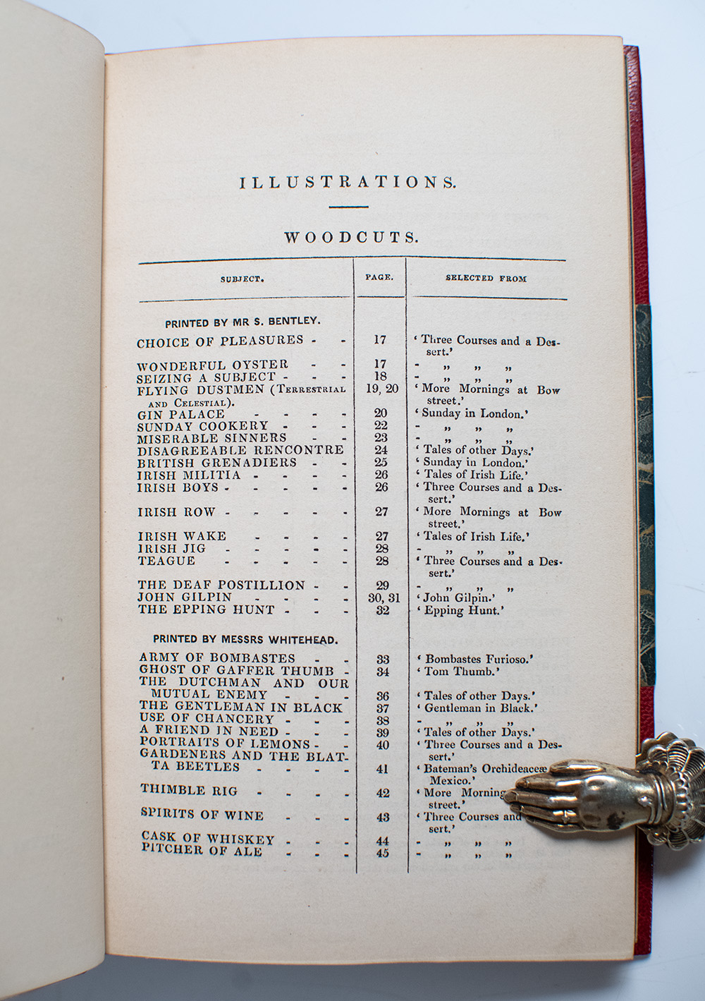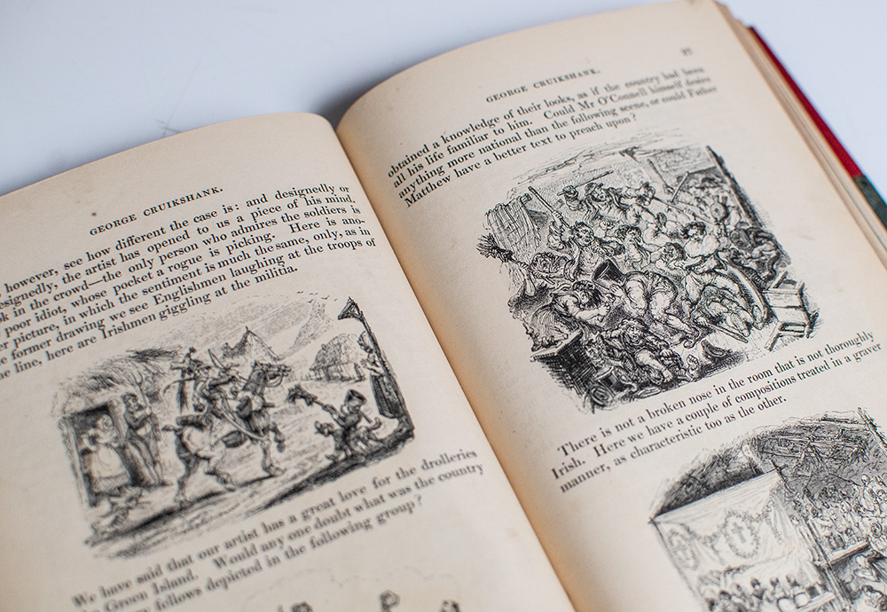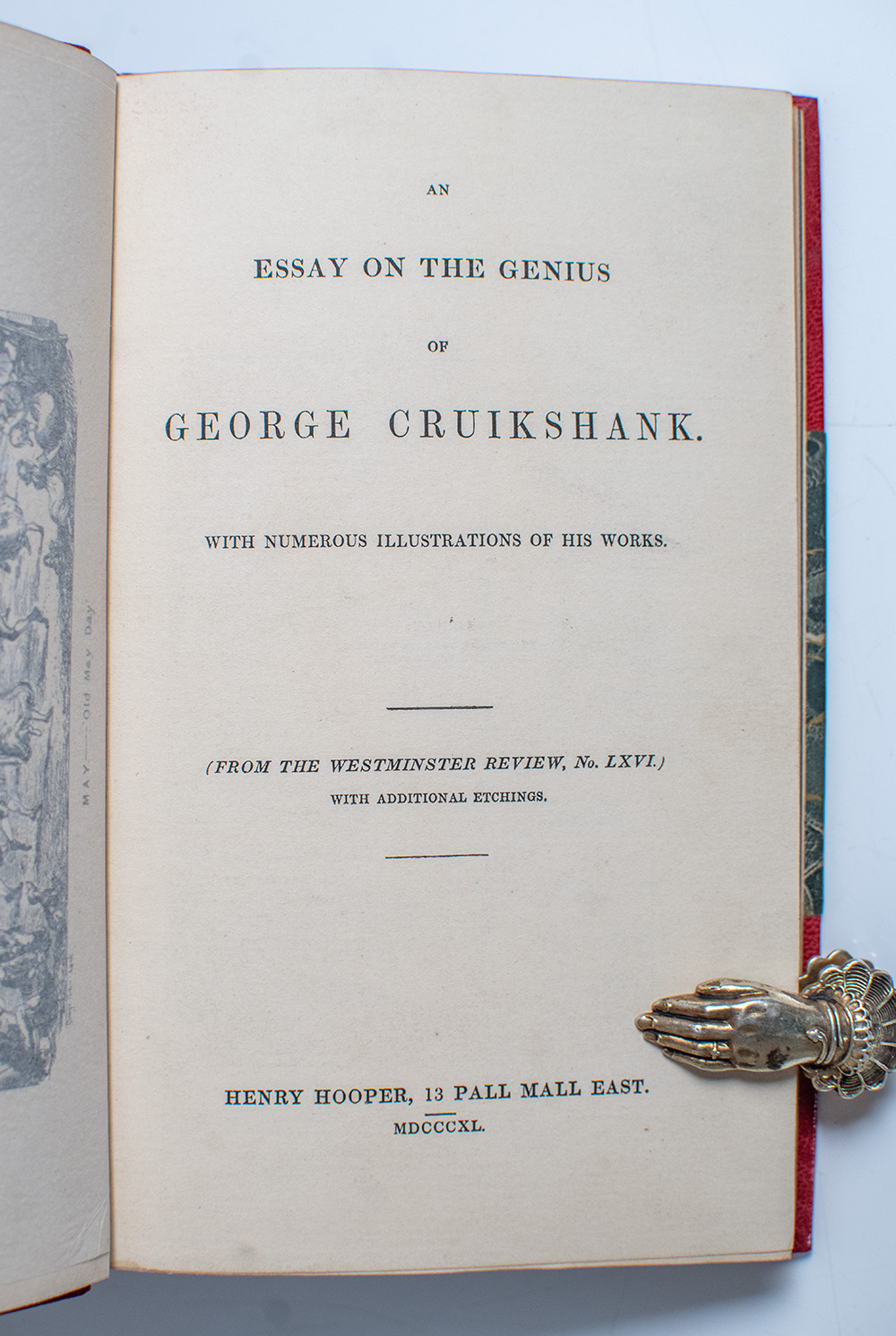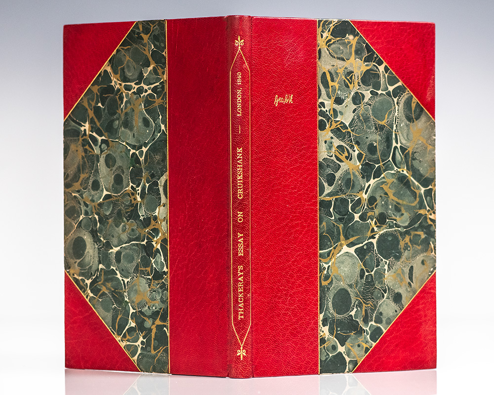 First edition of this essay highlighting George Cruikshank’s artistic skill and cultural significance in early Victorian Britain. Octavo, bound in three-quarters morocco by J. McDonald of New York with gilt titles and tooling to the spine, gilt ruling to the front and rear panels, gilt stamped facsimile signature of Cruikshank on the front panel, all edges gilt, marbled endpapers, tissue-guarded frontispiece, illustrated with 17 tissue-guarded black and white etched plates by George Cruikshank. In near fine condition.