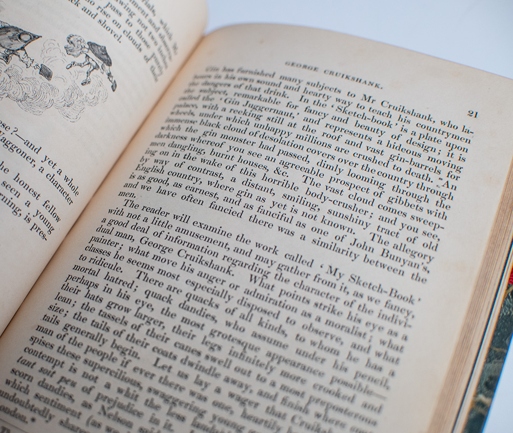 An Essay on the Genius of Cruikshank, published in The Westminster Review in 1840, is an early critical appraisal of George Cruikshank’s artistic achievements and cultural influence. Written at a time when caricature was often dismissed as ephemeral or merely humorous, the essay situates Cruikshank’s work within a broader artistic and moral framework, praising his sharp political insight, his ability to capture the nuances of everyday life, and his growing reputation as a serious illustrator of literature. By highlighting his transition from biting political satire to celebrated book illustration, particularly his collaborations with authors such as Charles Dickens, the review both legitimizes caricature as a form of social commentary and cements Cruikshank’s position as one of the most significant visual commentators of early Victorian Britain.