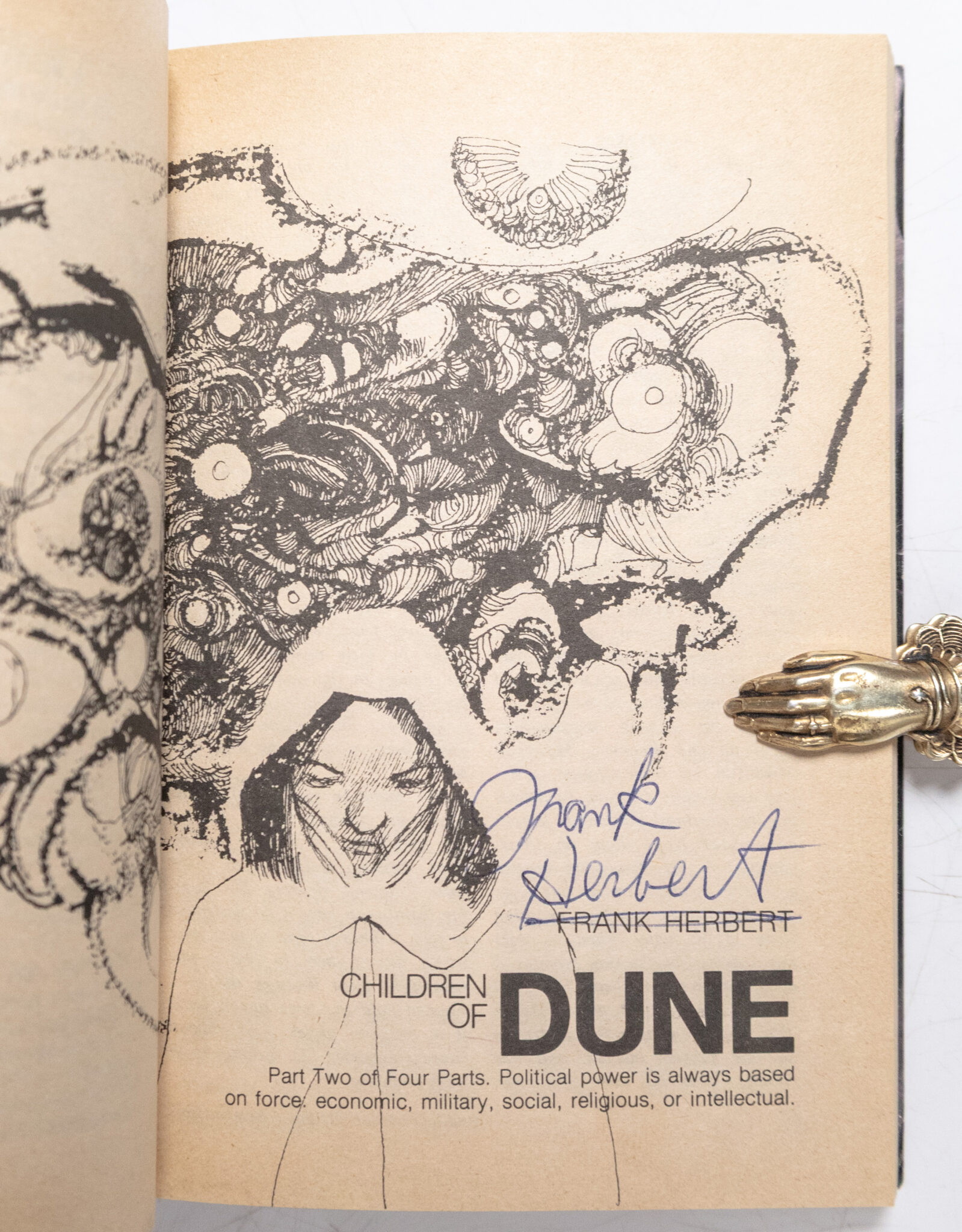 First edition of Analog: Science Fiction and Fact magazine containing the first appearance of the second part of Frank Herbert’s Children of Dune, later published as a novel. Octavo, issue February 1976, original pictorial wrappers, with black and white illustrations. Boldly signed by Frank Herbert above his name on page 63 of his contribution. In near fine condition with light creasing and soiling.