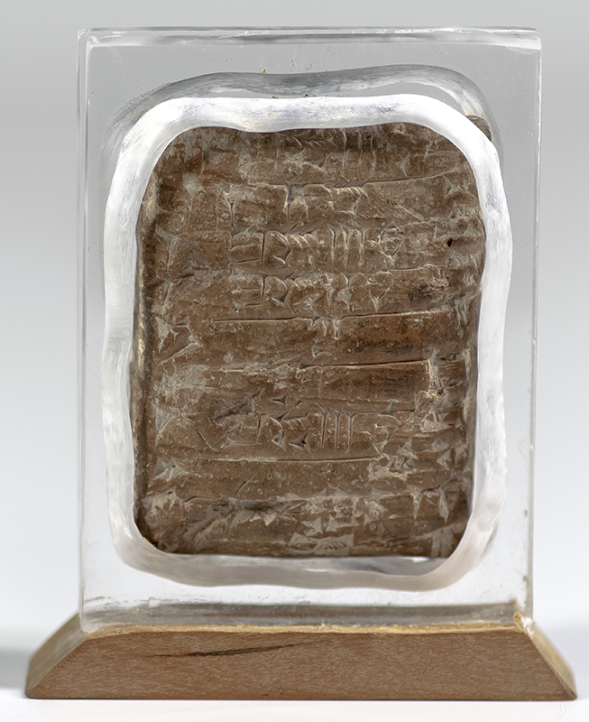 Rare ancient Sumerian Cuneiform tablet recording religious offerings made to several deities including Nin-lil, Enlil, Nanaya, Inanna, and Nanna. Clay, Third Dynasty of Ur, the tablet measures 1.75 inches by 2.25 inches and documents the offerings of sheep issued by Enlil-zishagl, a well-known official involved in many other similar texts that date to the reign of King Shu-Suen of Ur. Housed in a custom acrylic and wood mount.