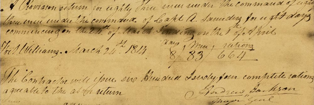 Autograph Document Signed by Andrew Jackson, dated Fort Williams, March 24th, 1814, concerning provision of rations for " ... eighty-three men under the command of Capt. A. Saunders for eight days ... ," fold creases and browning. Mounted with a printed engraved portrait of Jackson. Matted and framed. The entire piece measures