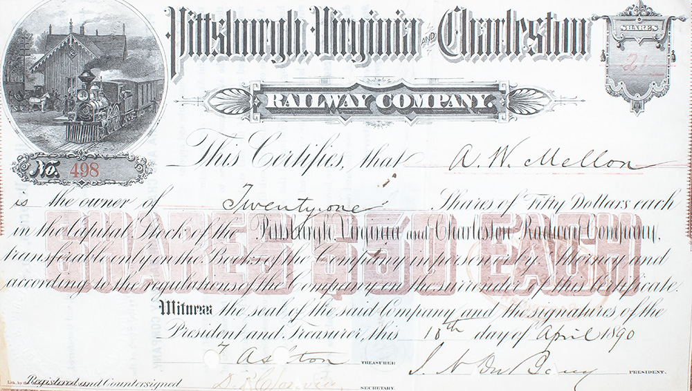 Rare Stock Certificate for the Pittsburgh, Virginia and Charleston Railway Company; Endorsed and Signed by Andrew Mellon