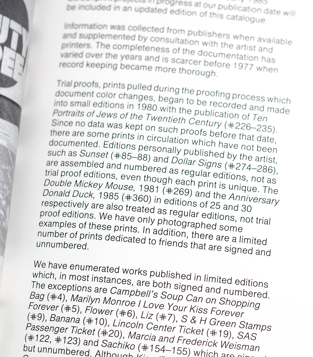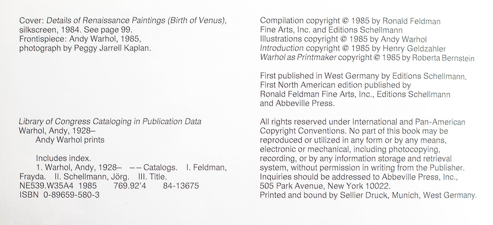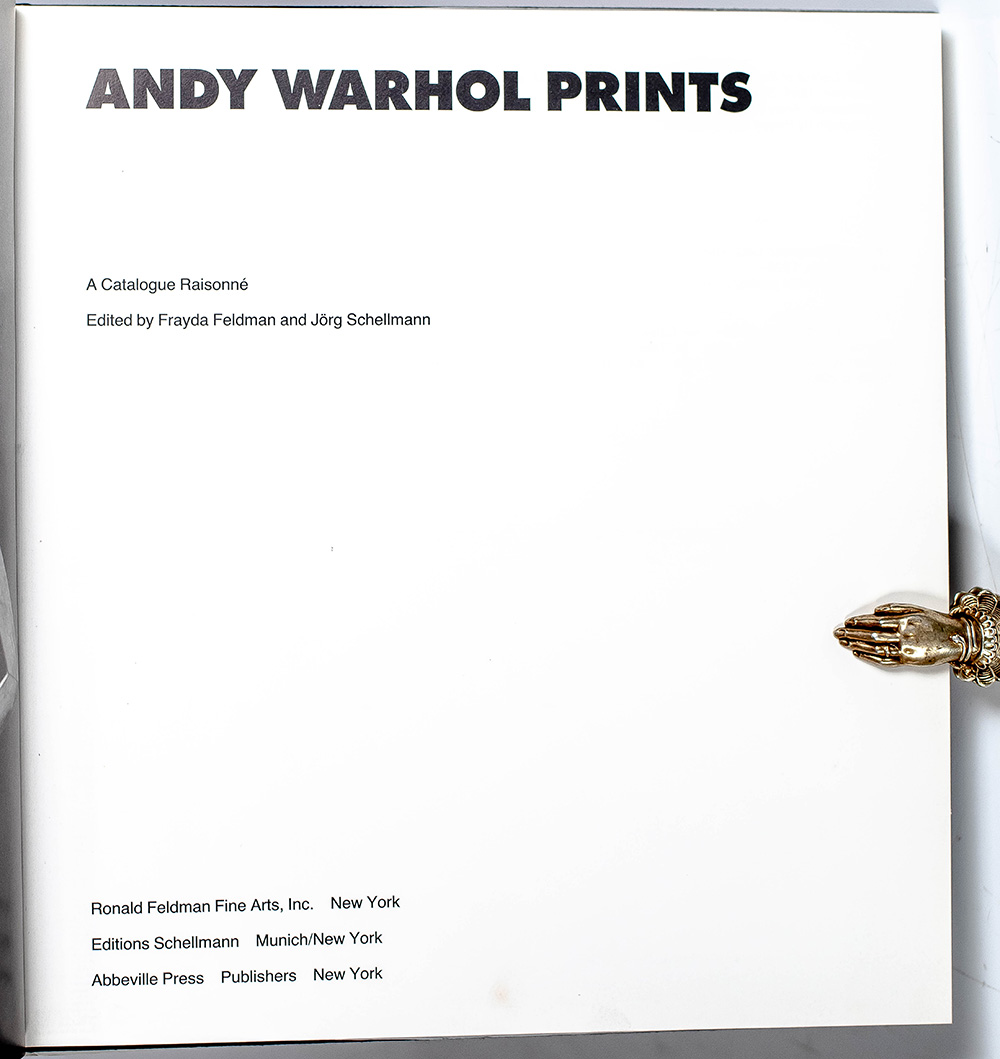 First edition of this definitive catalogue of Warhol's prints, spanning his entire career. Quarto, original cloth, with over 390 illustrations of Warhol's prints, including 344 in color. Boldly signed twice by Andy Warhol on both the front panel of the dust jacket and front free endpaper. Edited by Frayda Feldman and Jorg Schellmann. Essays by Henry Geldzahler and Roberta Bernstein. Near fine in a very good dust jacket. Cover: Details of Renaissance Paintings (Birth of Venus), silkscreen, 1984.