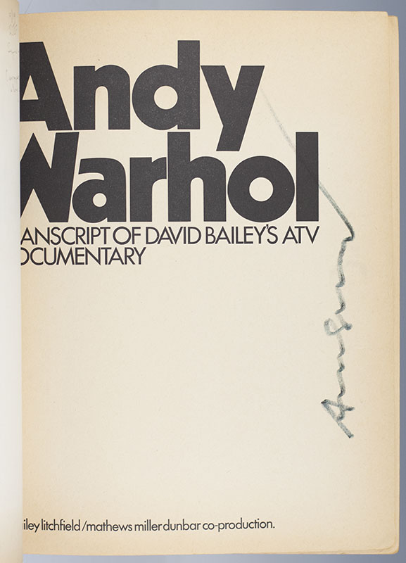 First edition of the transcript of David Bailey's documentary film 'Warhol' which was banned upon release due to its alleged explicit content. Folio, original illustrated wrappers, illustrated with photographs. Boldly signed by Andy Warhol on the title page. In very good condition.