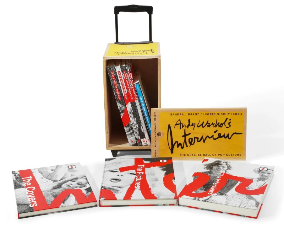 Complete portfolio of magazines plus wooden suitcase in the original shipping box, one of only 2000 examples. Book 1: The Covers. A facsimile reproduction of every cover from Interview's first decade; metallic cloth hardcover / 160 pages / color printing. Book 2: The Pictures. A selection of Interview photo-shoots from the first decade; printed fabric hardcover / 192 pages / tritone and color printing. Book 3: The Interviews. A selection of Q&As from the first decade; plastic-bound hardcover / 400 pages / Audio CD. Book 4: The Andy Warhol Interviews. A selection of interviews conducted by Warhol, with an introduction by Sandy Brant; clothbound hardcover / 192 pages. Book 5: The Fashion. A selection of interviews with fashion designers and great fashion photography from the first decade; clothbound hardcover / 192 pages / tritone printing. Book 6: The Directors. A selection of interviews with movie tycoons and related photos from the first decade; aluminum casebound hardcover / 192 pages. Book 7: The Back of the Book. A selection of columns by Fran Lebowitz and Bob Colacello, with photos; clothbound / 96 pages. In fine condition.