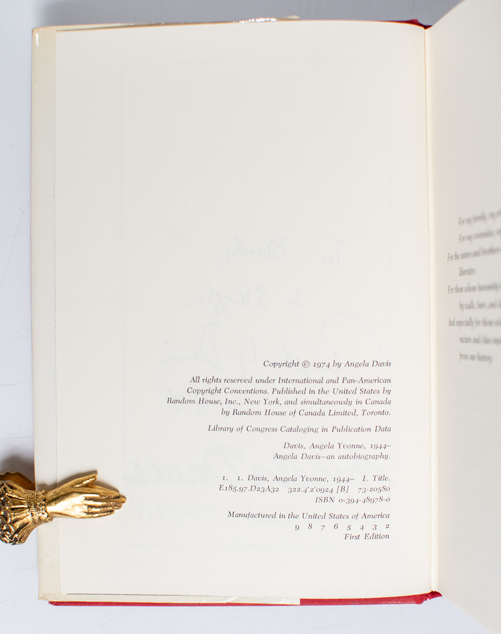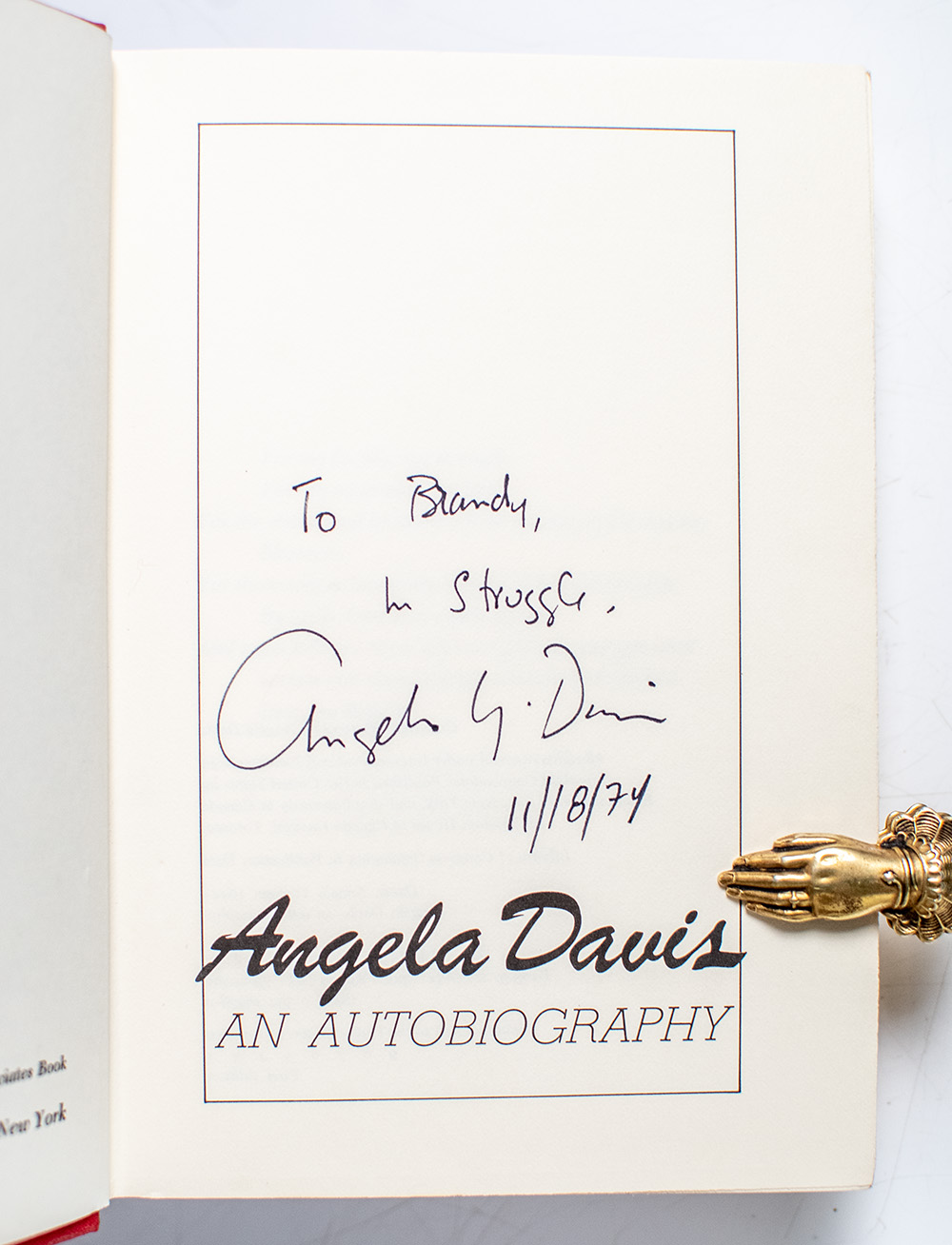 (Ibram X. Kendi). Octavo, original cloth. Presentation copy, inscribed by the author in the year of publication on the title page, "To Brandy, In Struggle, Angela Y. Davis 11/18/74." Near fine in a near fine dust jacket. Jacket design by Jack Ribik.
