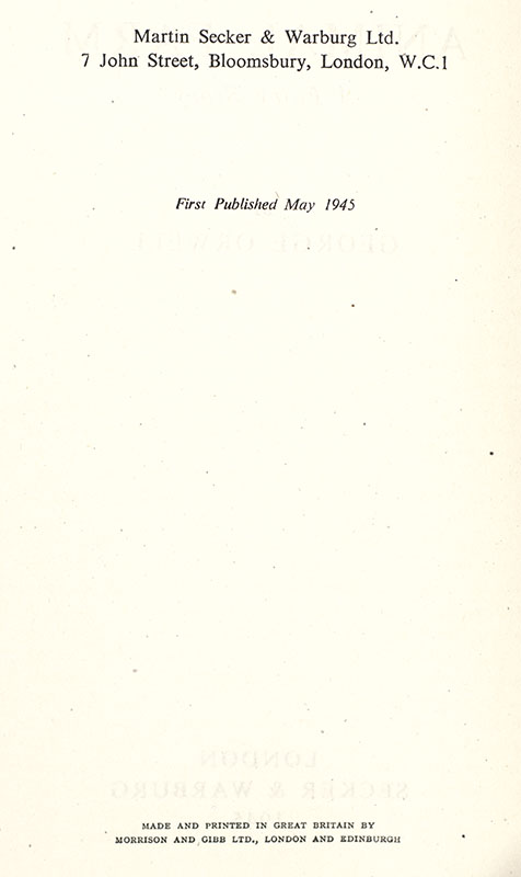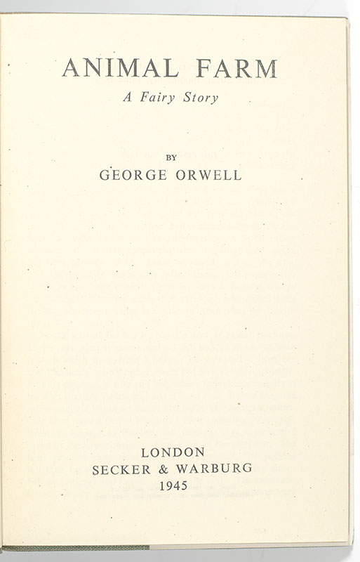 First British edition of Orwell's timeless allegorical novel— a scathing satire on a downtrodden society’s blind march towards totalitarianism. Octavo, original green cloth. Signed by George Orwell on the half-title page. Near fine in a near fine dust jacket with light rubbing to the extremities. The dust jacket has the Early List for 1945 to the rear panel and the Search light motif in red to the reverse of the jacket. The jacket has a stated price of 6s. An exceptional example of this classic Orwellian tale, most rare and desirable signed. The last signed example at auction brought 92,500 pounds. Housed in a custom half morocco clamshell box.