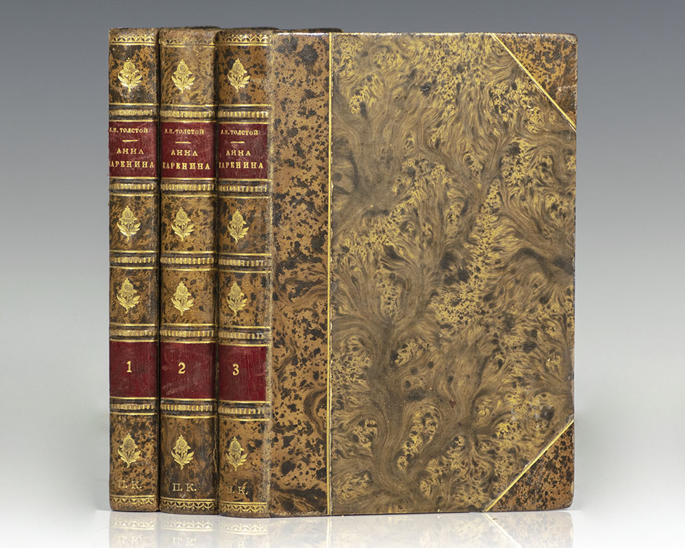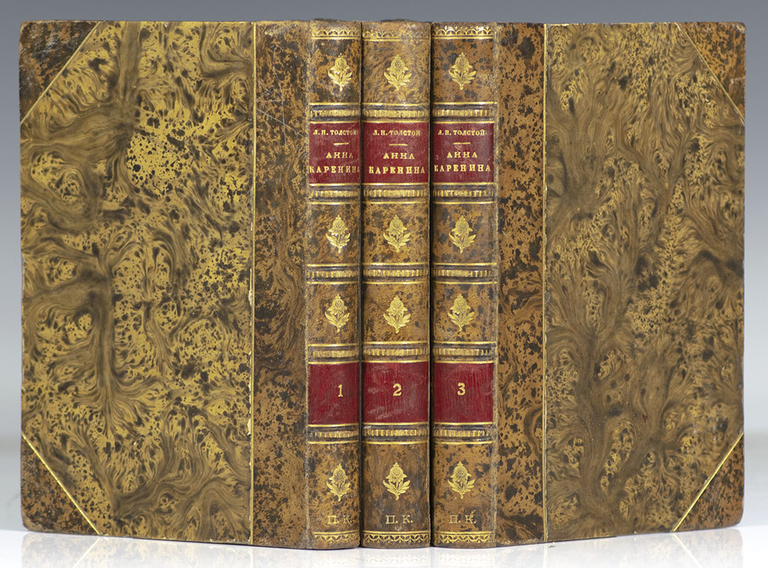 First edition in Russian of Tolstoy's masterpiece. Octavo, 3 volumes, bound in full calf, gilt titles and tooling to the spine and front panel. Housed in a custom half morocco chemise and clamshell box. In near fine condition. First editions in Russian are rare.