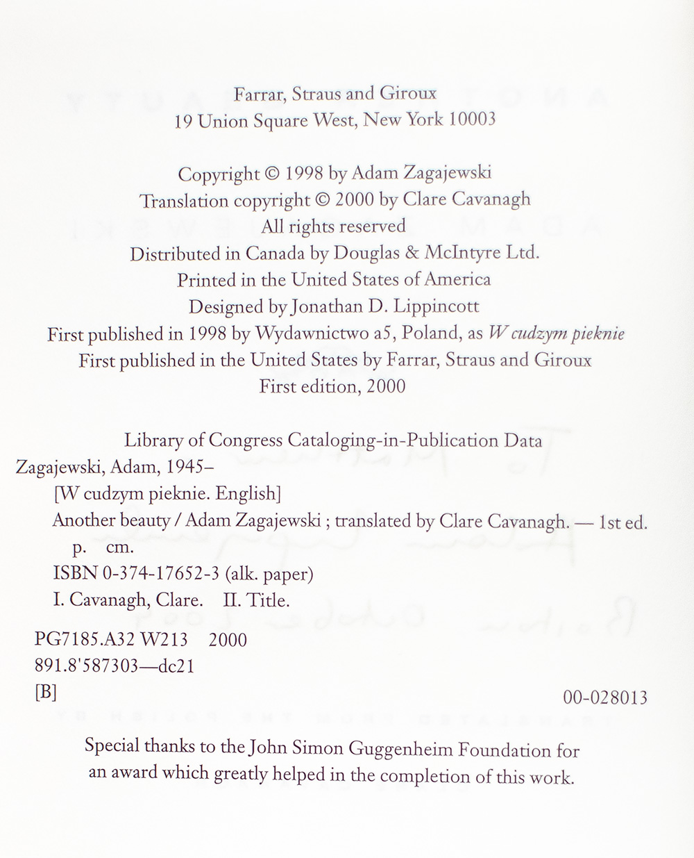 First Edition of Another Beauty; Inscribed by Adam Zagajewski