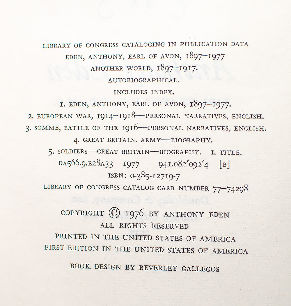 "So do the customs and legends of one's youth become fixed in memory, inaccurate and distorted maybe, but the only link one has with another world": First Edition of Anthony Eden's Another World; Finely Bound