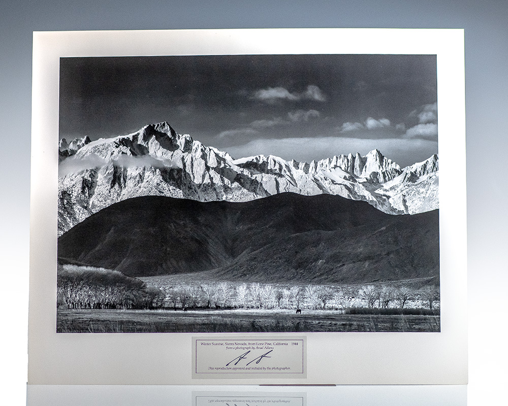 First edition, second printing of Adams' award-winning "ideal book, comprising his personal choice of pictures. Oblong folio, original half cloth. Laid in is a photograph of "Winter Sunrise..." (1944) approved and hand initialed by Adams; it measures 15.75 by 13 inches. Fine in a near fine dust jacket. With the original cardboard box.